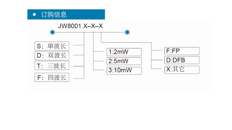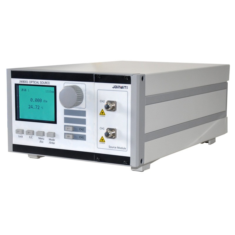 产品特点 1. 输出功率稳定度高:达到0.005dB; 2. 输出功率单独可调; 3. 波长稳定性好; 4. 高精度的APC和ATC电路; 5. LCD状态显示全参数; 6. CWDM或DWDM或其他任意波长可选; 7. 内设1~4个波长和多达4个输出口可选。 产品概述 JW8001台式稳定光源通过独特的自动光功率控制(APC)技术和自动温度控制(ATC)技术,输出功率稳定性高和波长稳定性好,能满足客户多重需求,可实现单一波长的输出。是测量衰减变化范围大、要求功率和波长十分稳定条件下,科研和生产的理想仪表。广泛用于光通信、光传输、光纤传感等领域中的科研、生产和工程等领域。