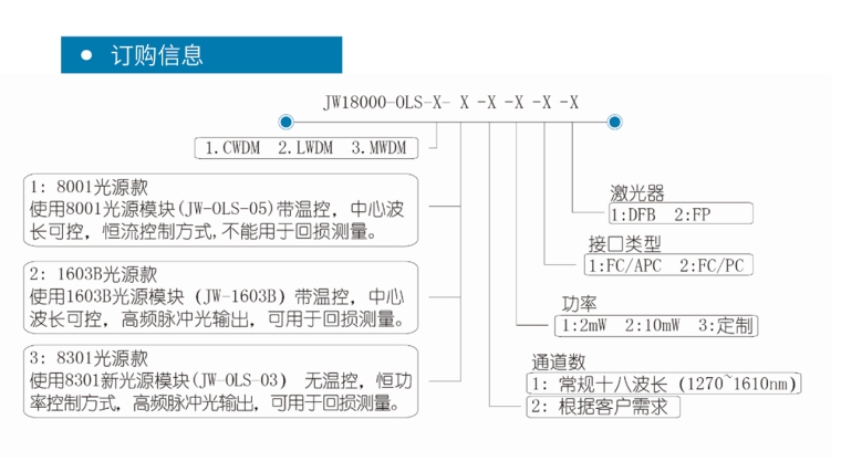产品概述 JW18000 OLS多通道光源输出功率稳定性高和波长稳定性好,能满足客户多重需求,可多波长同时输出。适用于CWDM、LWDM、MWDM测试,适用于测量衰减变化范围大、要求功率和波长十分稳定条件下,是科研和生产的理想仪表。 产品特点 1.输出功率稳定度高达0.03dB2.波长稳定性好 3.输出波长可定制4.温控功能可选5.支持串口通信 6.结构紧凑、操作简便 技术指标