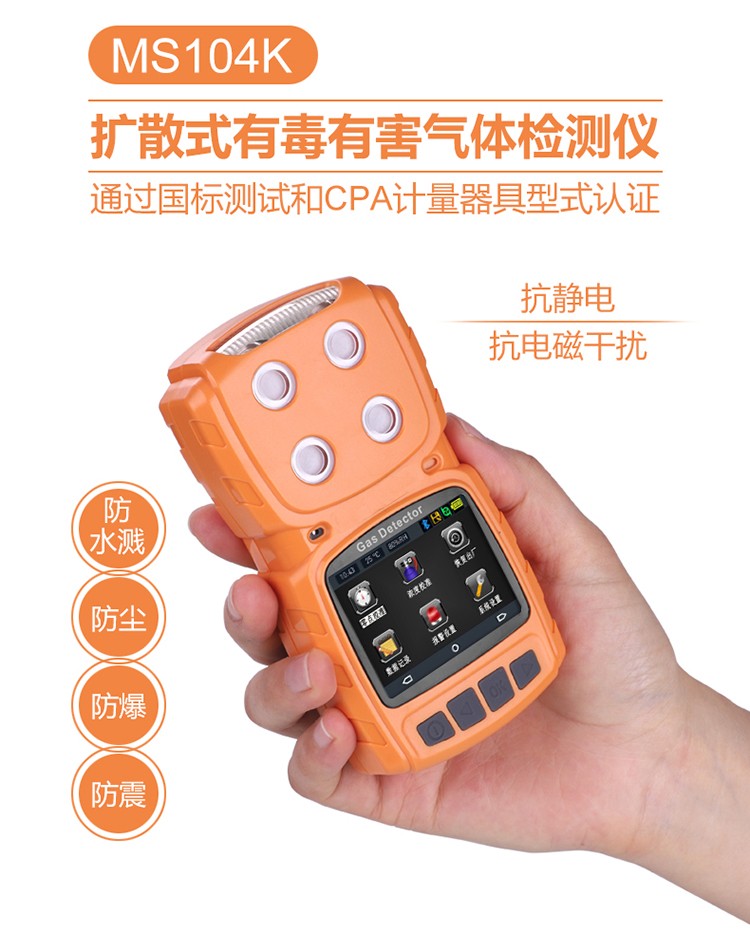MS104K便携式丙烷测试仪是一款移动式快速检测丙烷浓度的复合型气体检测仪,最多可以同时检测1~4种气体,具有大容量数据存储功能。MS104K便携式丙烷测试仪采用2 31寸高清彩屏实时显示浓度,选用知名品牌的气体传感器,主要检测原理有:电化学、红外、催化燃烧、热导、PID光离子。 MS104K便携式丙烷测试仪特点:●防水溅、防尘、防爆、防震,本安电路设计,抗静电,抗电磁干扰, 通过国标测试和CMC计量器具生产许可认证 ●防护级别IP65 ●2.31寸高清彩屏显示实时浓度、报警、时间、温度、湿度、存储、通信、电量、 充电状态等信息,菜单界面采用高清仿真图标显示各个菜单的功能名称 ●大容量数据存储功能。支持实时存储、定时存储,或只存报警浓度数据和时间、支持本机查看、删除数据,也可通过USB接口将数据上传到电脑,用上位机软件分析数据和存储、打印。Mf ●USB充电接口,过充、过放、过压、短路、过热保护,5级精准电量显示 ●采用2100mAH可充电高分子聚合物电池,可长时间连续工作 ●声光报警、振动报警、视觉报警、欠压报警、故障报警、关闭报警。 ●报警值可设,报警方式可选低报警、高报警、区间报警 ●可以选配同时检测1~4种气体,单位自由切换 单位可选:PPM、mg/m3、Vol%、LEL%、PPHM、ppb ●三种显示模式可切换:同时显示四种气体浓度、大字体循环显示单通道气体的浓度、实时曲线,各通道 之间自动循环或手动循环可切换,可设置是否显示最大值、最小值、气体名称,可查看历史记录。 ●中英文界面可选择,默认中文界面 ●数据恢复功能 ●零点自动跟踪 ●多级校准 ●浓度校准误操作自动识别并阻止 ●支持OEM或ODM订制,可以选配RS485通讯 ●选配环境温湿度测量功能,更多其他功能或通讯接口可订制。