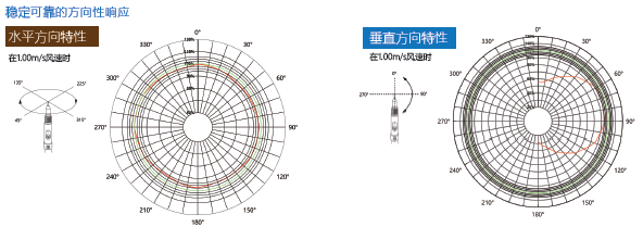 方向性响应 JT1411风速传感器探头为全向响应,这一性能对未知风向或不稳定风向、随机风向的风速测量尤为重要,JT1411在水平方向拥有优秀的方向响应特性,在不同角度(风向垂直于探头指向)的来风方向都能保持快速响应和精确测量。