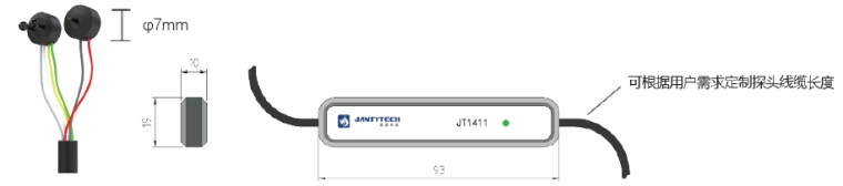 规格尺寸 Shape size 分体式风速与温度测量探头的设计,易于布置于通风散热的电子设备内部风速监测。