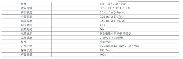 红外检漏仪使用了非色散式红外气体检测原理,随着技术的发展,制冷剂泄露检测技术也在不断的升级,非色散红外气体检测技术便是一种用于制冷剂泄露检测定位的新技术,它选择性好.寿命长,灵敏度高;它是利用卤素气体对某个特定波长的红外光吸收原理逬行设计的,当被测气体进入红外气室后会对红外光有不同程度的吸收,从而计算出卤素气体含量,进行漏孔的精确定位.红外传感器具有抗毒性好、量程范围广、反应灵敏等特点。 • IRSENS0R红外线传感器方式 •传感器寿命10年 •世界款TFT液晶显示红外检漏仪 •抗干扰性强,不中毒 •可检测新R32 , Rl234yf等HFCs , HCFCs , CFCs制冷剂 •检测精度可达2克/年 产品参数: