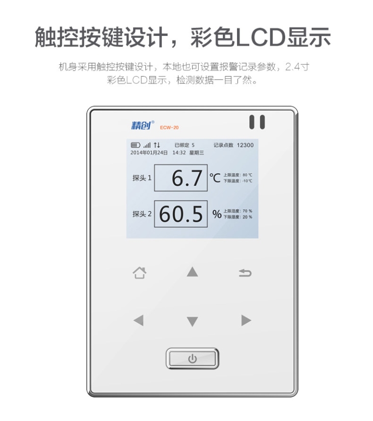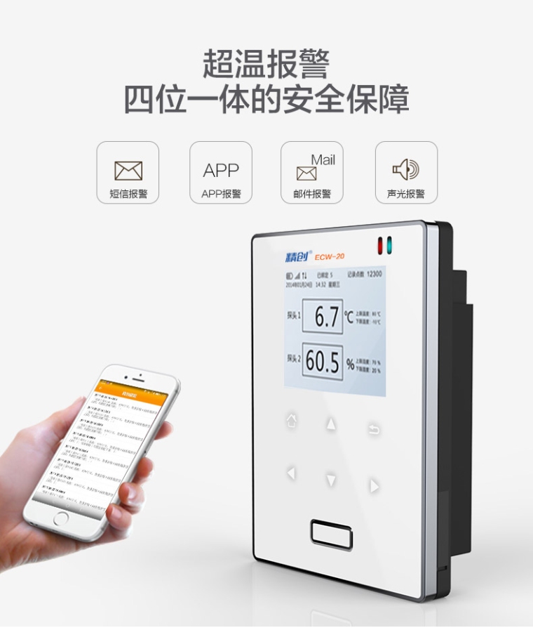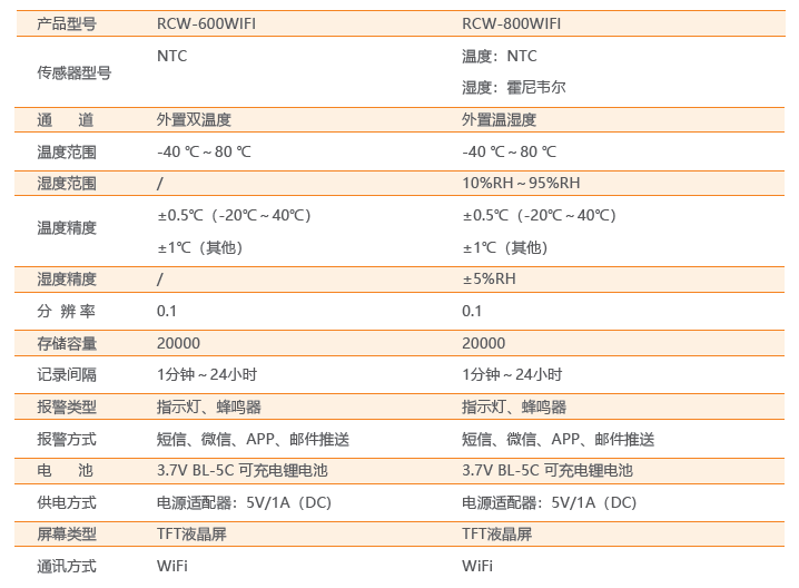 RCW Wifi 系列温湿度远程报警仪,是一款基于物联网技术的高新技术产品,通过WIFI 数据传输方式,结合冷链物联网平台, 客户通过浏览器或者智能手机终端在线实现实时监控数据远程查看和管理数据。同时还可以通过平台 报警,蜂鸣器报警提示功能。 产品特点: • 采用高精度传感器,反应快,灵敏度高 • 配置磁铁吸附安装支架,安装简便,操作简单 • 2000 组数据存储,支持断点续传 • Wi-Fi 网络通讯,节省运维费用 • 采取外接电源和内置可充电电池工作方式,具有断电报警功能 • 实时监测,支持短信、微信、邮件、APP 推送四种报警方式 • 可远程温湿度数据监测记录,数据云存储,安全可靠 技术参数: