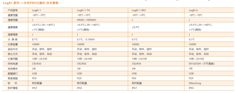 logEt系列记录仪主要用于记录敏温性强的产品在存储和运输过程中的温湿度数据,通过USB 接口配置参数和导出PDF 数据 报告,实现全程监测、安全精准,为储运保驾护航。 产品特点: • 高精度温度传感器,超高稳定性 • 特殊事件标记 • 数据加密保护 • 可重复使用,电池两年超长续航 • 造型精致,防护等级可达IP65 以上