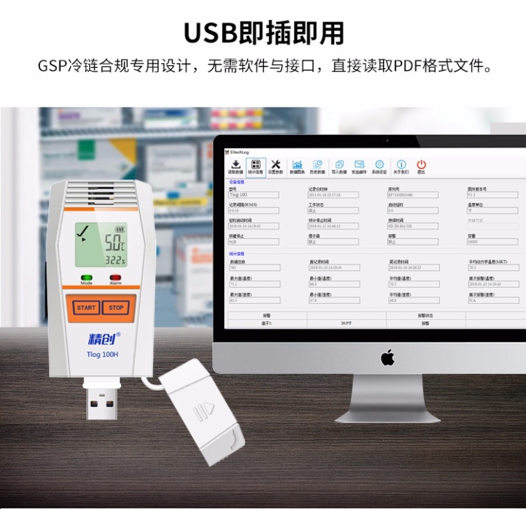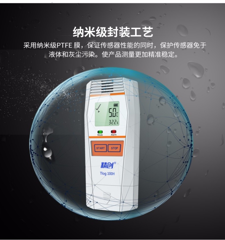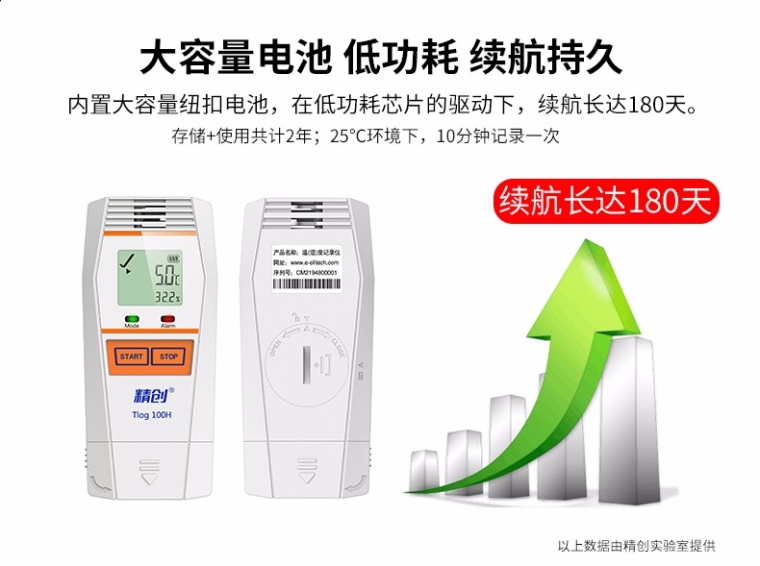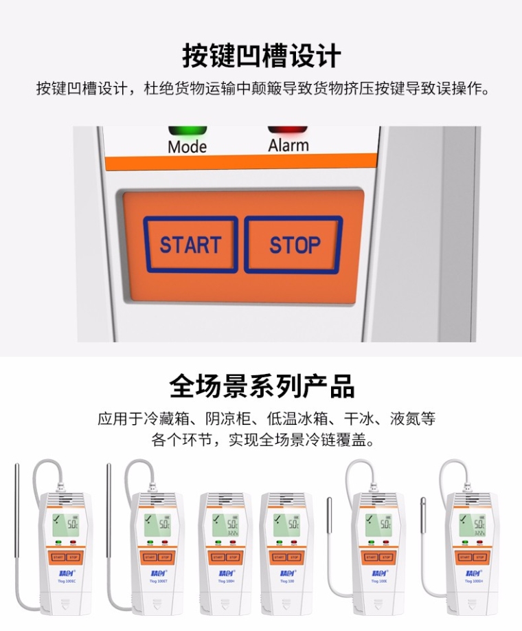 本系列记录仪具有LCD 液晶显示和防止误触碰的双按键设计。按键操作可查看设备状态和记录参数;支持多种启动方式、停止方式、多个阈值设置,以满足不同用户的需求;支持记满停止和循环覆盖两种存储方式;可自动生成PDF 报告,无软件也可随时查看数据。蓝牙款可通过APP 进行参数配置、数据读取、蓝牙打印,实现无需开箱即可查看数据,简单、方便、实用。 产品特点: • 高精度传感器:Sensirion 原装进口,原厂精准调校 • 纳米级封装工艺:采用纳米级PTFE 膜,保证传感器性能的同时,保护传感器免于液体和灰尘污染 • 全新风腔设计:基于空气流动的风腔设计,与周围环境保持佳热耦合,快速感应环境实际温度 • 按键凹槽设计:杜绝货物运输中颠簸导致货物挤压按键导致误操作 • 安全安心 合规:符合GSP UN38.3 NIST CE 认证标准、软件符合美国FDA 认证
