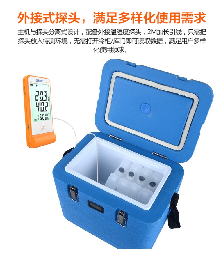 该记录仪主要用于监测记录食品、药品、化学用品等产品在存储和运输过程中的温湿度数据,广泛应用于仓储、物流冷链的各个环节。该记录仪符合新版GSP 要求,LCD 大屏显示,超限声光报警,单按键操作,内置温度传感器、外置温湿度传感器,支持记满停止和循环覆盖两种存储方式,可设置超限自动缩短记录间隔功能。 产品特点: • 2.8 寸 LCD 大屏显示,增加可视距离 • 自由设置报警阈值,支持超限声光报警 • 外接式探头,满足多样化使用需求 • 大容量数据存储,通过数据管理软件管理数据 • 背磁吸附式安装方式,安装简单