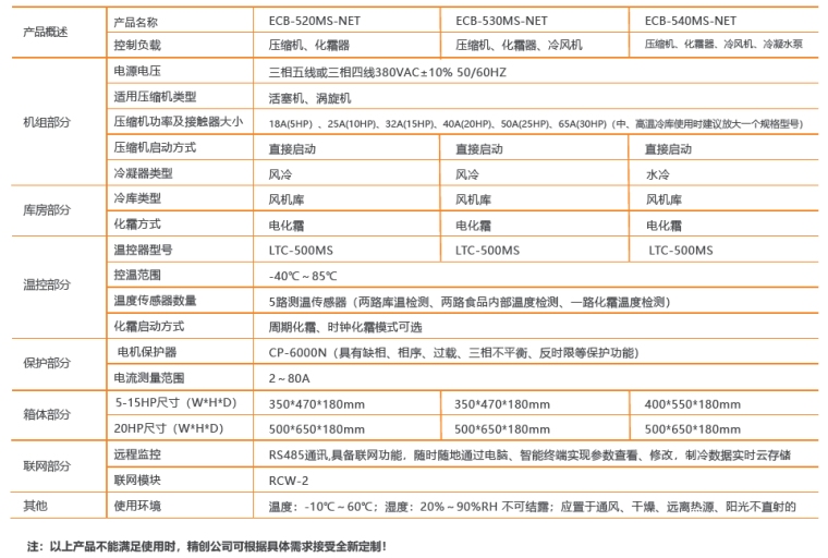 产品特点: ● 相序、缺相、过载保护功能 ● 大面板彩色数码管显示,触控按键技术 ● 时系统监测,保障食品品质;通过对制冷系统的实时监测和数据分析,实现系统的安全、可靠、高效运行,保证储藏物安全 ● 5路温度探头其中2路插针式食品中心探头,2路库温传感器探头,1路化霜传感器探头, 可以按照平均温度控温也可以指定某一根探头控温,其中一根探头故障可自动切换且报警 ● 云储存,采用符合美国FDA认证的精创冷云平台,可以实现制冷数据实时云存储,完整记录系统运行数据,支持系统分析,生成系统运行报告 技术参数: