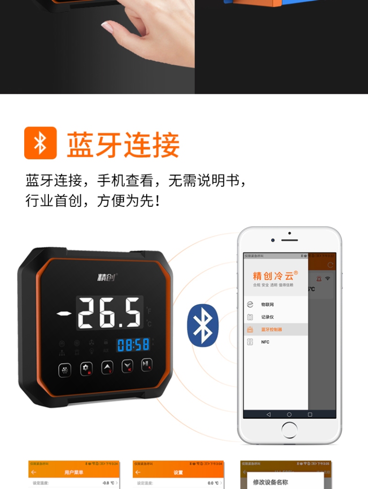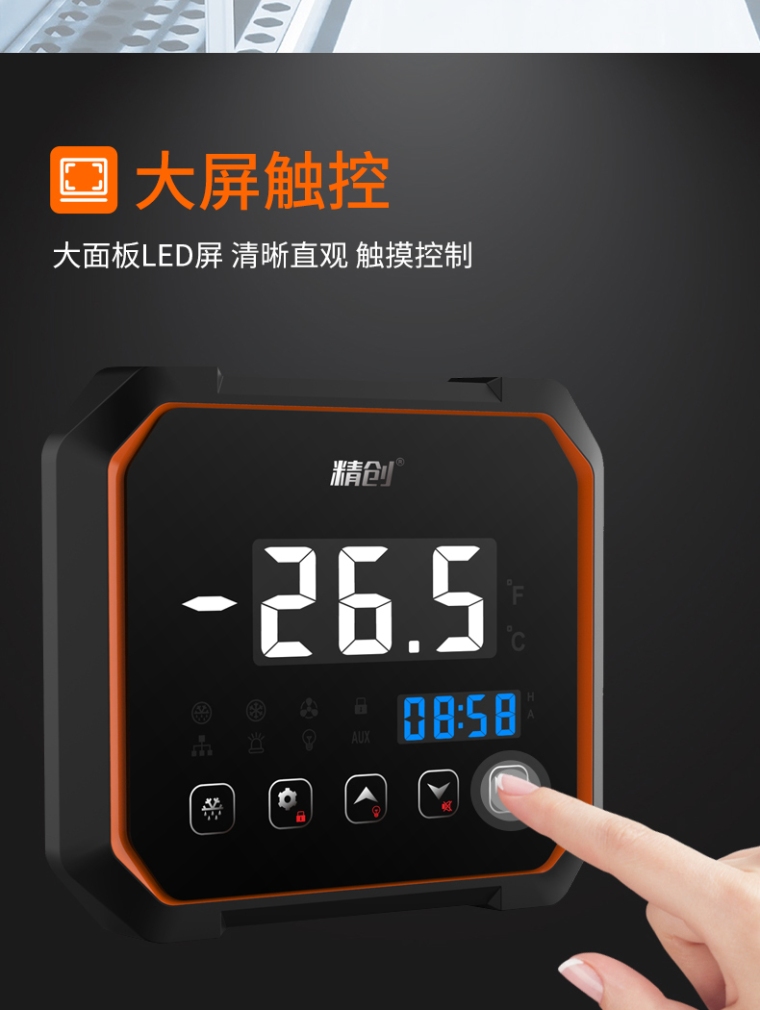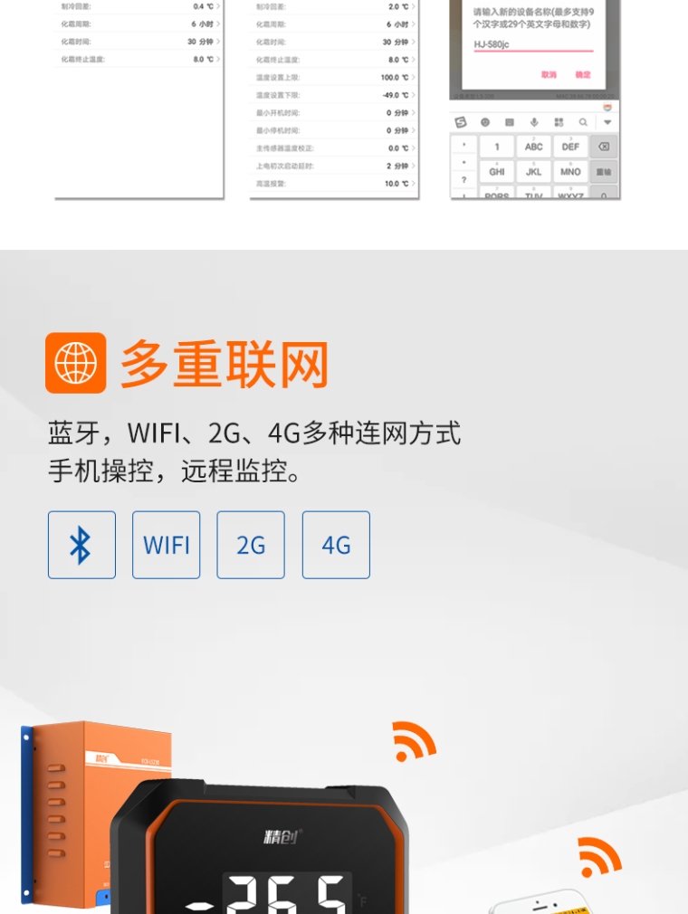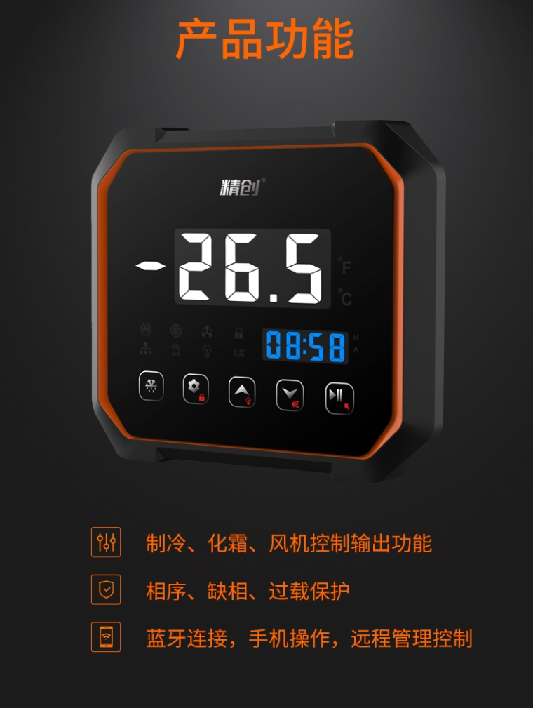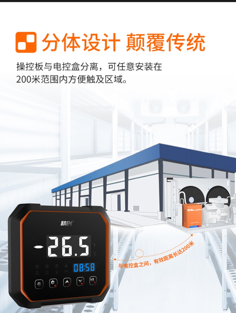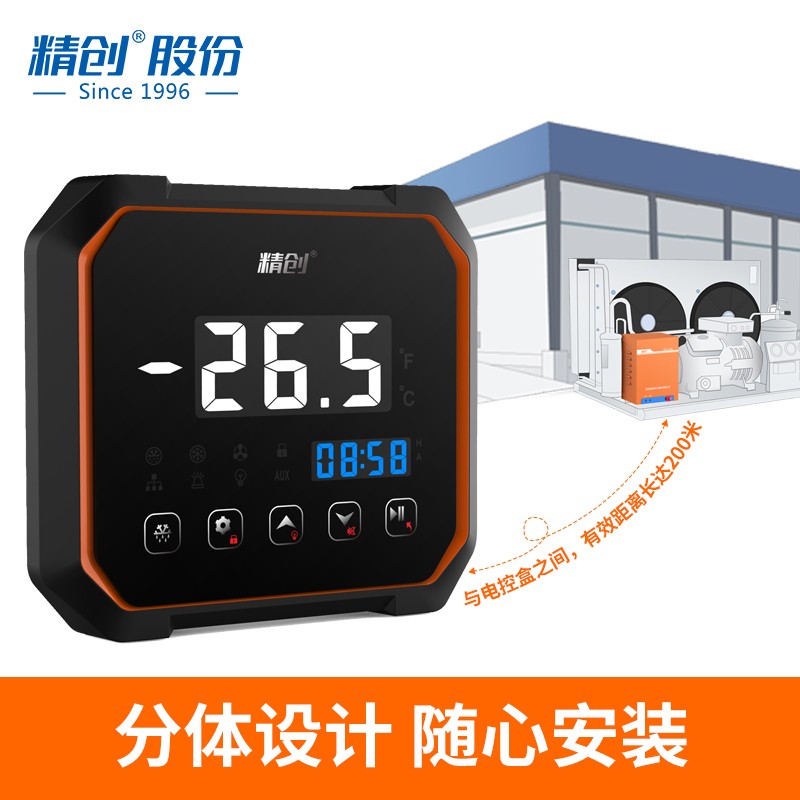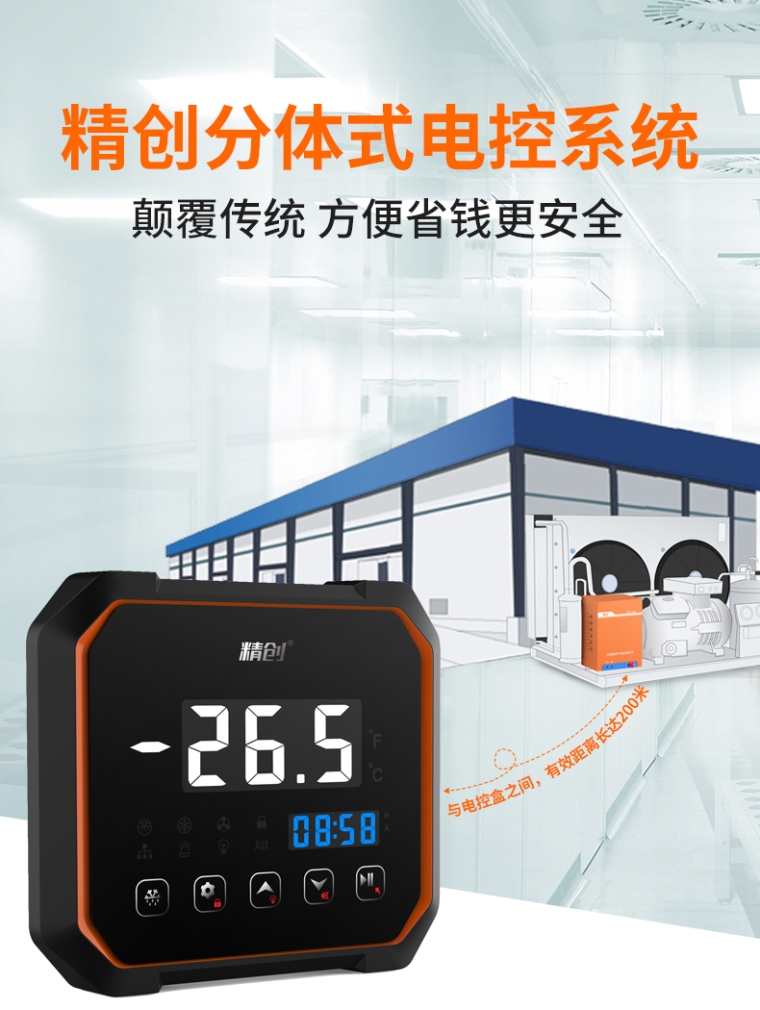 精创分体式电控系统LS-230是应用于小型冷库上的控制箱,具有制冷、化霜、风机、灯光控制输出功能,具有报警功能,时钟显示功能,通过WIFI、4G、蓝牙模块可以连接我司APP、平台。 功能特点: 方便:手操板与电气盒分离,手操板可任意安装至方便查看、操控处; 省钱:电气盒与机组就近安装,节省动力线成本; 安全:强弱电分离,操控安全可靠,避免线材老化导致的冷库自燃; 大屏触控:大面板LED屏,清晰直观,触控按键; 蓝牙连接:无需说明书,APP快速一键设置; 多重联网:2G、4G、Wifi多种连网方式,实现远程监测。