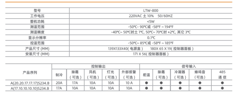 ● 触摸按键设计,适应用于高端控制柜 ● 液晶屏历史曲线显示,温度变化更直观 ● 分体式设计,主显板通讯控制,便于安装 ● 内置联网模块,支持wifi、蓝牙、4G 多种通讯连接 ● 前面板防水等级IP65 ● 大5 路输出,功能可选配 ● 制冷继电器大可达到20A/240VAC,可直接驱动2HP/240VAC 压缩机、 ● 控制器具备温度传感器自检功能,检测到系统故障时具有多种保护和报警方式; ● 具备拷贝卡功能和参数一键还原功能,方便生产制造商的生产、售后工作; ● 数字信号的多种配置模式,适用于各种类型的数字信号输入方式; ● 柜内温度超限报警具备值和相对值两种模式; ● 具备完整的热气除霜卸压启动控制逻辑,防止带压启动,从而延长压缩机的寿命; ● 两级ECO-DOOR 节能模式,自动识别重度经营、轻度经营及非经营模式; ● 主机可读/ 写控制器参数,可读取控制器工作状态及故障状态,从机可指定/ 同步除霜、开关机、开关照明; ● 支持扩展外部显示器TPM-950 连接,适用于商厨、商超、蛋糕、冰淇淋柜等。