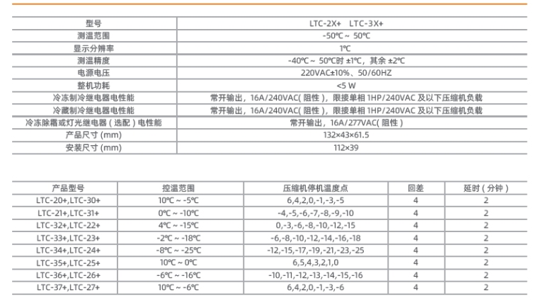 ● LTC-3X+ 系列具有定时停机除霜功能,LTC-2X+ 系列无停机除霜功能;