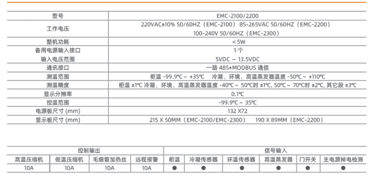● 分体式控制器安装灵活方便; ● 四路温度传感器用于柜温调节、高温蒸发器温度限制、冷凝器温度监测、环境温度监测; ● 四路控制输出可进行高温压缩机控制、低温压缩机控制、毛细管加热、远程报警; ● 全面的控制系统保护,具有高低温报警、压缩机保护报警、传感器异常报警、断电报警、远程报警输出; ● MODBUS 通信输出温度数据; ● 快接端子接线,方便专业设备制造商的生产和售后。