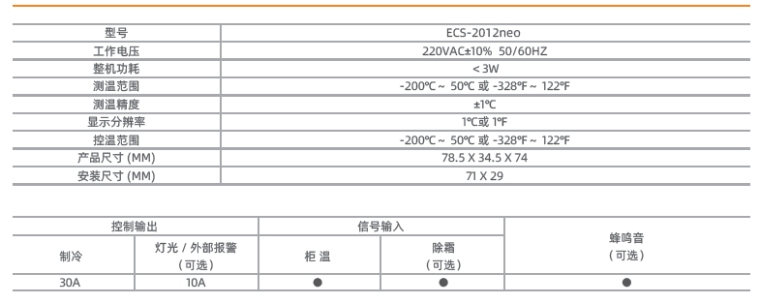 ● 超低温控制,低测量温度可达-200℃; ● 可使用菜单转换华氏/ 摄氏制; ● 可配置两路温度传感器用于柜温调节和除霜控制; ● 可配置两路控制输出,压缩机控制,灯光/ 除霜控制; ● 选择灯光控制时除霜以自然除霜进行; ● 控制器显示温度值可参数配置为柜温或蒸发器温度值显示; ● 多重保护和报警功能,保障设备安全; ● 拷贝卡功能,可快速管理、调整产品参数; ● 传统螺钉式接线方式。