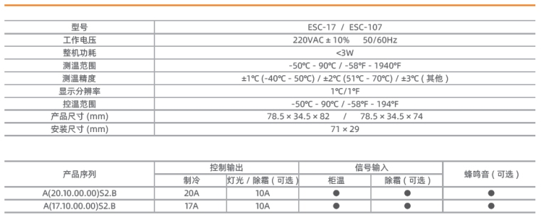 ● 可进行压缩机、灯光控制; ● 一路温度传感器用于柜温调节; ● 可使用菜单转换制冷/ 制热工作模式; ● 特设一键还原功能,多组参数目录可供选择; ● 可通过参数选择开关直接切换两组工作参数组; ● 快接端子接线,方便专业设备制造商的生产和售后; ● 可与面板表TPM-950 连接实时同步显示控制器测量温度 (ECS-107) ; ● 控制器具备温度传感器自检功能,检测到故障时具有多种保护和报警方式。 产品参数: