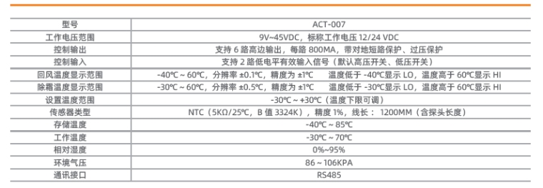 制冷、制热、除霜、备电、数码管亮度自动调节等基本功能,预留远程通讯接口,可配合联网模块,实现远程监控、远程参数设置、远程开关机,车辆轨迹回放等增强功能。可用于冷藏车非独立式压缩机制冷系统。 ● 按键采用轻触开关配合橡胶按键帽的方式,手感清脆,大大延长薄膜面贴的寿命; ● 采用蓝色高亮数码管,阳光直射可清晰辨识; ● 人性化界面显示,实时显示各工作状态。 ● 根据不同车型,支持软件定制和成套解决方案。 ● 安装支架牢固,保证操作不松脱。 产品输入输出 6 路输出(输出800MA 带载能力,带有短路保护) 2 路传感器输入 2 路压力开关检测输入(正常接地) 关于工况 具有成熟的路用工况、备电工况控制逻辑 注重软件的控制细节,对冷藏系统的保护和保养有很大的益处 主要参数 具有温度设定、制冷制热选择、除霜温度显示 除霜间隔时间、除霜工作时间、回风温度补偿 温控循环Δ值选择、允许除霜温度设定、除霜终止温度设定 设定温度下限限制、12V,24V 系统选择等 参数分厂家设置和用户设置区分,避免用户误操作影响核心参数 产品可靠性: 产品符合GB/T 28046(道路车辆 电气及电子设备的环境条件和试验) 符合 ISO7637-2(电源线传导)及具有较强的静电防护 EMC 抗辐射能力等,详情请见冷藏车型式试验测试项目
