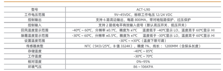 制冷、制热、除霜、备电、数码管亮度自动调节等基本功能,预约远程通讯接口,可配合联网模块,实现远程监控、远程参数设置、远程开关机,车辆轨迹回放等增强功能。可用于冷藏车非独立式压缩机制冷系统。 ● 采用高清双显数码管,可现实多温区显示控制 ● 人性化界面显示,实时显示各工作状态 ● 根据不同车型,支持软件定制成套解决方案 ● 配置可多角度调节的安装支架 ● 预留USB 接口可现实参数拷贝功能 ● 按键采用轻触开关配合橡胶按键帽的方式,手感清脆,大大延长薄膜面贴的寿命 产品输入输出 6 路输出(输出800MA 带载能力,带有短路保护) 2 路传感器输入 2 路压力开关检测输入(正常接地) 关于工况 具有成熟的路用工况、备电工况控制逻辑 注重软件的控制细节,对冷藏系统的保护和保养有很大的益处 主要参数 具有温度设定、制冷制热选择、除霜温度显示 除霜间隔时间、除霜工作时间、回风温度补偿 温控循环Δ值选择、允许除霜温度设定、除霜终止温度设定 设定温度下限限制、12V,24V 系统选择等 参数分厂家设置和用户设置区分,避免用户误操作影响核心参数 产品可靠性 产品符合GB/T 28046(道路车辆 电气及电子设备的环境条件和试验) 符合 ISO7637-2(电源线传导)及具有较强的静电防护 EMC 抗辐射能力等,详情请见冷藏车型式试验测试项目