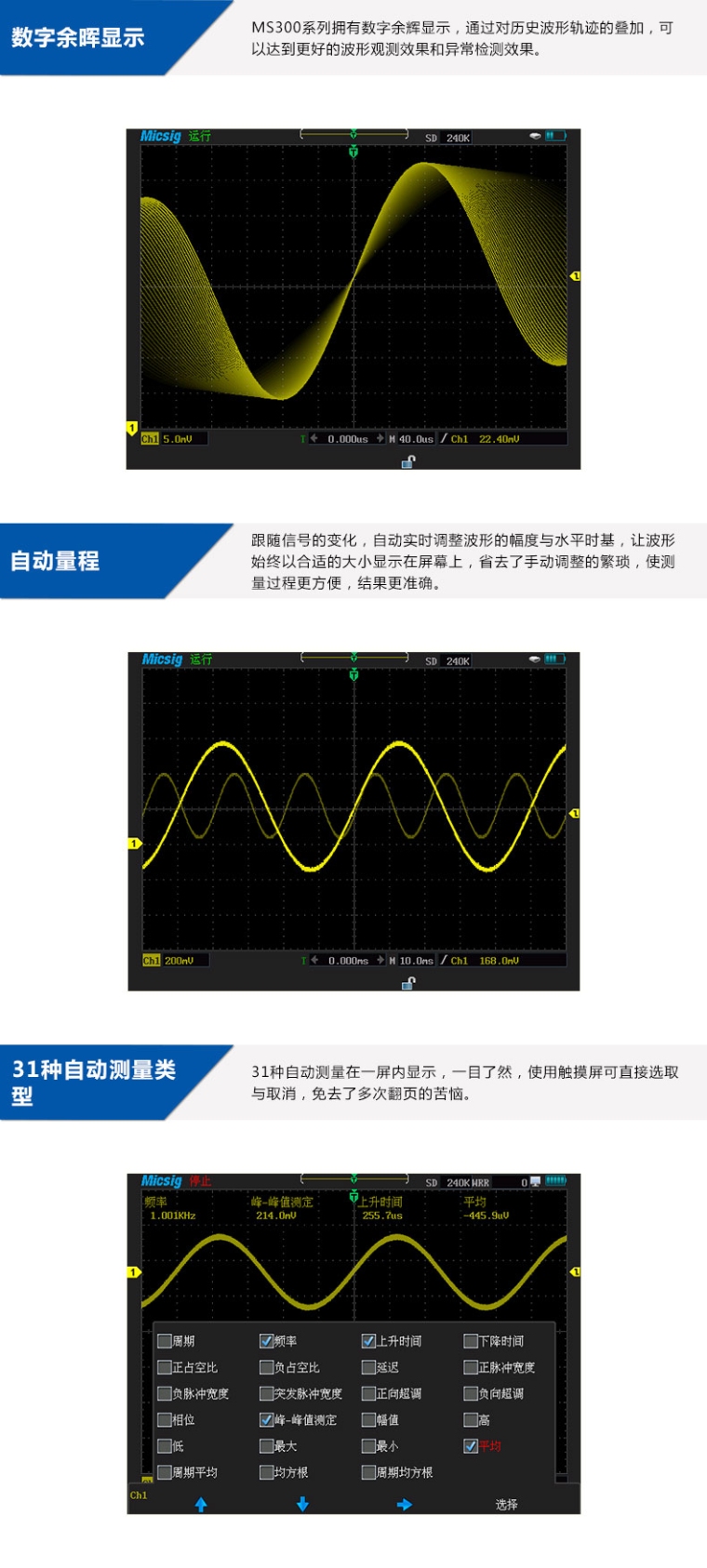 手持示波器MS320S 200MHZ,1GS/S,240Kpts,2-CH,5万次/s,隔离通道,5种总线触