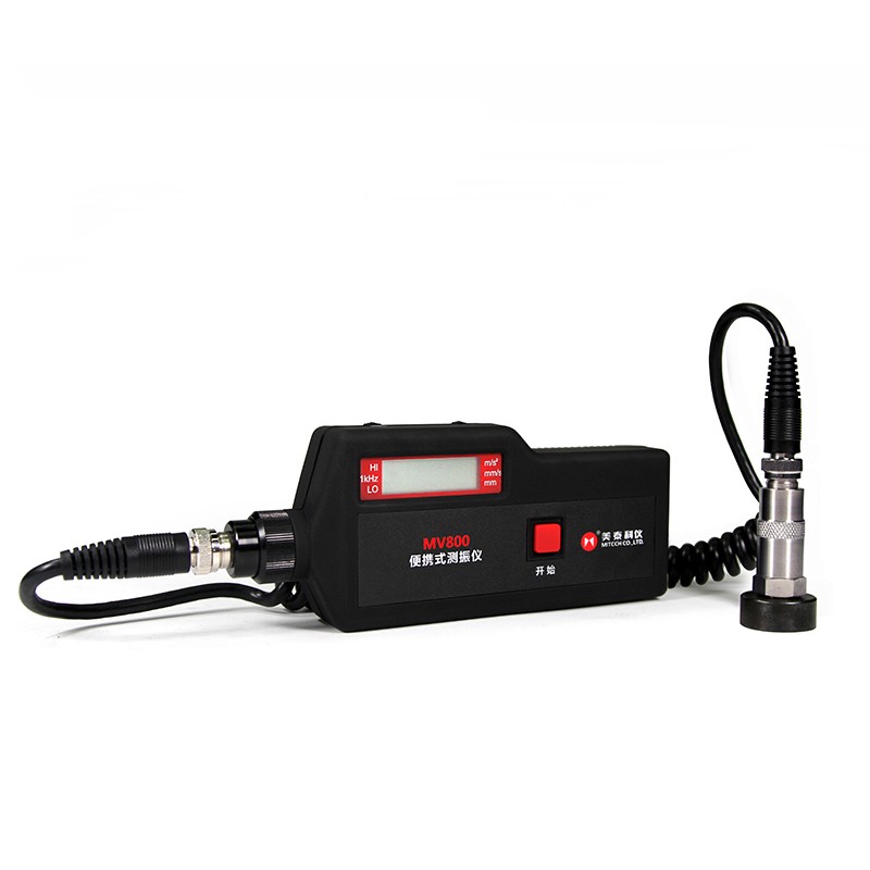 美泰便携式测振仪MV800系列是由压电式传感器和数字显示电路组成的手持式测振仪表,主要用于测量各种旋转机械的振动加速度、速度和位移。MV800系列分两种型号MV800-5(频响范围:5Hz~10KHz)和MV800-10(频响范围:10Hz~10KH),可满足常规测振使用需求以及低频振动测量需求。该产品测量范围广,显示直观、一体化的设计体积小、重量轻,测量携带方便,特别适用于野外无电源的现场作业及高空作业,大大减少工作人员的工作强度,提高工作效率。 功能用途 美泰便携式测振仪MV800系列主要应用于设备状态监测方面的机械振动测量,如机械制造、电力、冶炼、车辆等领域,具体来说,它常被广泛应用于轴承、齿轮、电机、风扇、机床等机械设备的快速检查和预防性检查。 工作原理 美泰便携式测振仪MV800系列是利用石英晶体和人工极化陶瓷(PZT)的压电效应设计而成。当石英晶体或人工极化陶瓷受到机械应力作用时,其表面就产生电荷,采用压电式加速度传感器,把振动信号转换成电信号,通过对输入信号的处理分析,显示出振动的加速度、速度和位移值,得出测量结果。 工作条件 操作温度:0~50℃ 存储温度:-30℃~+70℃ 相对湿度:低于90%RH 仪器特点 分体式先进精巧设计、体积小巧便于携带、性能稳定可靠、功耗低、造型美观; 高对比度段码液晶显示,界面设计人性化易于理解,操作简单方便; 适应恶劣的现场操作环境,抗电磁干扰能力强,测量精准; 配备高可靠性环形剪切加速度传感器,性能远远优于压缩式传感器; 具有高低频分档测量功能,振动测量时便于识别判断设备故障类型; 设有自动休眠、自动关机等节电功能; 符合国际相关标准,测量值与国际振动烈度标准(ISO2372)比对可直接判断设备运行状态; 具备信号输出功能,选配专用耳机连接仪器,实现设备听诊器功能; 具备信号输出功能,选配专用示波器,用来监测、记录振动信息; 操作方法及注意事项 仪器操作 ①按住“测量”键(电源键处于测振位置)不动,将MV800传感器磁座吸在被测物体表面,并确保牢固稳定,这时显示器上显示振动测量值; ② 待显示测量值稳定后,松开“测量”键,测量值将保持在显示器上。现在可以把传感器从被测物体上拿开,读取并记录测量值; ③再按“测量”键,可退出保持状态,重新测量; ④松开“测量”键大约一分钟后,电源自动关闭; 操作详解 测前准备 ①安装电池: 打开电池盖,按照电池仓内图示电池极性正确装入6F22(9V叠层)型电池,盖好电池盖。 ②检查电池电压: 按下“测量”键观察显示。如果出现“:”(如图所示),表示电池电压低,需要更换新电池。 探杆选择和安装 探杆选用原则当测量10Hz~1KHz低频范围内的位移、速度或加速度时,可选用长探杆;当测量1KHz~10KHz高频范围内的位移、速度或加速度,尤其在需要保证测量数据的可靠性时,宜选用短探杆;当要求加速度在1KHz以上的高频范围内有一个平坦的频响时,可不使用任何探杆。 短探杆 短探杆一般是必备的,这种探杆在10Hz~10KHz的频率范围内,具有可靠的性能。 长探杆 由于被测物体周围空间或其他条件限制,使用短探杆困难时,可选用8cm的长探杆。在10~1KHz低频测量时,长探杆对于震动的相应频率良好,但是,在高于1KHz时,响应频率会下降。因此,在使用高频“HI”档测量加速度时,应尽量选用短探杆。 不安装探杆 不安装探杆直接用传感器测量物体振动的使用方法只有在接触面相当良好的情况下才可应用,如果传 感器与被测物体接触面积不足或接触不良,则不能保证测量在高频范围内有平坦的响应频率。如果物体表面粗糙,则应涂上一些粘性的蜡,以保证有良好的频率响应。 传感器连接 ①用专用导线将传感器与测振仪连接 ②取下磁铁上的护片及橡胶垫 ③将磁铁吸在测点表面上 测量完毕,应将传感器与被测表面呈一定倾角掰下来,不能直拽,以免吸力太大损坏导线。 参量/频率开关选择 使用仪器测量物体时应选择正确的参量或频率范围(频率范围设置仅限于加速度测量,速度及位移测量时频率开关一般处于低频档位)。 设置振动参量 对于不同测量需求,用“测量参量选择开关”选择不同的测量参量——加速度、速度、位移,此时,显示器右边的光标“ ”指示所选择的物理量。 设置频率范围 测量不同振动频率下的加速度参量时,需切换“频率范围选择开关”选择低频“LO”或高频“HI”档位进行测量,此时,显示器左边的光标“ ”指示所选择的频率范围。 信号输出及故障听诊 振动信号由“信号输出接口”输出,这个接口可以监测记录振动波形并输出,还可以接驳专用耳机,用作故障听诊器。(输出信号在满量程时,输出2V峰值交流波形) ①将耳机佩戴连接好,按住测量键不动,将测量参量选择开关拨至加速度档(m/s2),进行振动测量; ②调节耳机上的音量按钮,即可听到振动声音; ③切换频率范围选择开关,可分别听到高频声音和低频声音; 故障判断 美泰便携式测振仪MV800的加速度档具有高低频分档功能,可判断滚动轴承故障或齿轮箱故障:分别测量振动加速度高频值(HI)和低频值(LO)并进行比较,当低频值大于高频值时,说明振动主要由低频引起,应按速度标准判定,可以考虑轴系类故障,如转子不平衡、轴弯曲、轴不对中、基础松动等;当高频值大于低频值5倍以上时,说明振动主要由高频引起,可考虑轴承、齿轮类故障,如滚动轴承磨损、齿轮断齿等。 注意事项 使用确保