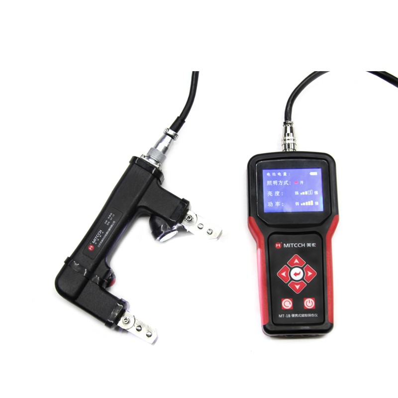 MT-1B型便携式磁粉探伤仪,采用大容量锂电池组供电,将充电电池提供的直流电经过变频逆变和信号移相处理,为磁粉探伤仪提供磁化电源,解决了传统磁粉探伤仪依赖220V电源的弊端;功耗低,一次充电可连续工作4小时以上,电池可以在线充电和脱机充电。特别适用于野外无电源的现场探伤及高空作业,它实现了磁粉探伤数字化的革新。 功能用途 飞机制造、锅炉压力容器、电力、油田、造船、汽轮机和内燃机配件、煤矿、机械、标准件、油泵油嘴、汽车零件、造桥、化工、铁路、大型机械零部件、钢结构设备等行业产品;因锻压、淬火、焊接、疲劳等引起的表面及近表面缺陷,如链杆、曲轴、轴承、高强度螺栓、弹簧、锻件、石化管件、阀门、叶片、齿轮、锚链以及焊缝等几何形状复杂的工件等。 工作原理 将待测铁磁性材料的物体置于强磁场中或通以强大电流使之磁化,若物体表面或表面附近存有缺陷(裂纹、折叠、夹杂物等),磁力线在这些缺陷附近会产生漏磁,当将导磁性良好的磁粉(通常为磁性氧化铁粉)施加在物体上时,缺陷附近的漏磁场就会吸住磁粉,堆集形成可见的磁粉痕迹,在合适的光照下形成可见的磁痕,从而显示不出连续性的位置、大小、形状和严重程度,将缺陷显示出来。 工作条件 环境温度:操作温度-10℃~+40℃ 存储温度:-20℃~+70℃ 相对湿度:≤80% 周围环境无强烈振动、无强烈磁场、无腐蚀性介质及严重粉尘 仪器特点 智能高清3.2寸彩色液晶显示,可显示电池电量、照明方式、照明亮度和输出功率; 大容量锂电池组供电,可任意携带现场,解决了传统磁粉探伤仪依赖220V电源的弊端,功耗低、体积小,电池可在线充电,亦可脱机充电。特别适用于野外、高空探伤; 照明亮度、照明方式、功率、磁轭间距可调,满足不同环境下的探伤需求,设置状态可进行存储; 新型电源模式的应用,使本产品不论在检测缺陷的深度还是在检测表面的灵敏度方面都得到了提升; 电磁轭采用脉动式供电技术,可连续不间断工作,不受传统电磁轭必须要间隙时间的限制; 集传统磁粉探伤仪全部优势于一身,检测近表面缺陷快速、清晰、准确; 仪器小巧,配有仪器包,操作者可将仪器斜跨于腰间,大大减少探伤人员的劳动强度,提高工作效率。 操作方法及注意事项 在执行探伤操作时,步骤及注意事项如下: 1.用连接线连好马蹄铁式磁轭探头,然后开机,按上、下方向键,使黄色三角标在;探伤检测项上,按确认键,进入探伤检测。启动探伤检测;后,可根据探伤工件大小,适当调节探伤器磁极开度距离; 2.干粉探伤时,工件表面要干燥。将适当干燥磁粉均匀地施加于工件有效探伤范围内,在工件探测表面上以小于40mm/s的速度缓慢移动磁轭探头,进行多方向的垂直探伤,使两磁极与被探工件接触良好。观察磁粉流动时有无磁粉聚集,如有异常变化时应该变磁轭开度,调节磁场强度,反复进行探伤检测; 3.对工件探伤面进行探伤时,必须有一定重叠,每次重叠区域不小于25mm,做到多方位探伤。当发现磁粉有聚集时,应及时分析磁痕形成的原因,并正确判断相关磁痕、非相关磁痕。要正确判断各种磁痕特征; 4.如在探伤过程中,发现磁粉聚集,可用吹磁粉器吹去多余的磁粉,使缺陷磁粉显示清晰; 5.若磁痕难以判断,应通过修磨重新探伤或采取其他方法确认,如果判定磁痕是缺陷磁痕,应将摄像头对准磁痕显示处,按确认键,拍下磁痕显示照片; 6.拍摄完磁痕显示照片后,按上下方向键,使光标停在功能项上,按确认键,屏幕显示存储对话框(或直接按存储;键); 7.根据对话框显示项目,依次输入: a. 单位:光标在“单位”前闪动,按确认键进入,按左、右方向键选择使用单位,选择完毕后,按确认键; b. 人员编号:光标“人员编号前”闪动,按确认键进入,按数字键,输入操作者编号,输入完毕后,按确认键; c. 修程:光标在修程;前闪动,按确认键进入,按左、右方向键选择当前修程,选择完毕后,按确认键,并按数字键,输入修程次数,输入完毕后,按确认键; d. 部件名称:光标在部件名称前,部件名称项在探伤前已经确定,此项即为默认,不用重新选择; e. 部件编号:光标在部件编号前,按确认键进入;部件编号项,在部件编号后面出现横杠光标闪动,按数字键输入当前检测的部件号,如需要输入字符或是字母,可按打印键,打开软犍盘输入,按上下左右方向键,选择字母或字符,按确认健输入,完毕后,再按打印键可关闭软键盘,继续其他数字的输入,输入完毕后,按确认键; f. 探伤方法:光标在探伤方法前,按确认键进入,在探伤方法后面出现横杠光标闪动,按左、右方向键选择干法或湿法选择完毕后,按确认键。g. 缺陷长度:光标在缺陷长度前,按确认键进入,屏幕显示存储的缺陷图像,在屏幕上显示一个光标,按方向键,使光标到达缺陷的一个端点,按确认键; h. 缺陷性质:光标在缺陷性质前,按确认键进入,按左右方向键选择缺陷类型线形/圆形选择完毕后,按确认键; i. 缺陷部位:光标在缺陷部位前,按确认键键入,屏幕出现当前检测的工件图形,屏幕上有一个可移动的指示光标,按上、下、左,右方向键,使光标停留在发现缺陷的位置处,按确认键,仪器自动存储其他缺陷部位; j. 存储号:光标在存储号前,按确认键,存储完毕,对话框关闭。仪器返回到待机状态,如继续探伤,按上下方向键,使光标重新返回到探伤检测项,按确认键,继续进行探伤操作; 如不存储探伤记录,按右