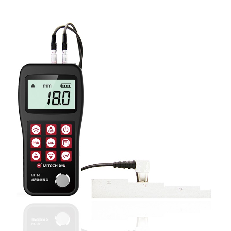 美泰MT150 超声波测厚仪,基于超声波测量原理,可对金属、塑料、陶瓷、玻璃及其他多种超声波的良导体材料进行厚度测量,也可实现对材料声速的反测。与传统的测量方法相比,超声波测厚仪的优势在于它只要接触到被测工件的一面即可完成测量,其独特的无损检测性能为封闭类管材、容器等厚度检测受局限的工况提供了**的解决方案,被广泛应用于石油、化工、冶金、造船、航空、航天等领域的生产设备中各种管道及压力容器腐蚀减薄程度的监测,也可用于对各种板材及各种加工零件做精确的测量。 功能用途 适合测量金属(如钢、铸铁、铝、铜等)、塑料、陶瓷、玻璃、玻璃纤维及其他任何超声波的良导体的厚度可配备多种不同频率、不同晶片尺寸的双晶探头使用具有探头零点校准、两点校准功能, 可对系统误差进行自动修正已知厚度可以反测声速,以提高测量精度具有耦合状态提示功能有EL背光显示,方便在光线昏暗环境中使用有剩余电量指示功能,可实时显示电池剩余电量具有自动休眠、自动关机等节电功能小巧、便携、可靠性高,适用于恶劣的操作环境,抗振动、冲击和电磁干扰。 工作原理 本超声波测厚仪对厚度的测量,是由探头产生超声波脉冲透过耦合剂到达被测体,一部分超声信号被物体底面反射,探头接收由被测体底面反射的回波,精确地计算超声波的往返时间,并按下式计算厚度值,再将计算结果显示出来。 H=v×t/2 式中:H-测量厚度 v-材料声速 t-超声波在试件中往返一次的传播时间 为确保探头正常工作,需使用耦合剂以隔绝探头表面与待测工件表面间的空气,这种液体用于探头及工件间的耦合,称之为耦合剂 工作条件 环境温度:操作温度-20℃~+50℃ 存储温度:-30℃~+70℃ 相对湿度≤90% 周围环境无强烈振动、无强烈磁场、无腐蚀性介质及严重粉尘 仪器特点 适合测量金属(如钢、铸铁、铝、铜等)、塑料、陶瓷、玻璃、玻璃纤维及其他任何超声波的良导体的厚度 可兼备多种不同频率、不同晶片尺寸的双晶探头使用 具有探头零点校准、两点校准功能,可自动修复系统误差 已知厚度可以反测声速,以提高测量精度 具有耦合状态提示功能 有EL背光功能,方便在光线昏暗环境中使用 有剩余电量指示功能,可实时显示电池剩余电量 具有自动休眠、自动关机等节电功能 小巧、便携、可靠性高,适用于恶劣的操作环境,抗振动、冲击和电磁干扰 操作方法及注意事项 ① 将探头插头插入仪器探头插座中; ② 按开机键,伴随着开机蜂鸣声,仪器屏幕显示开机画面后自动进入测量界面,并显示当前仪器中设置的声速值,此时仪器的各参数为上次关机前使用的参数。 探头零点校准 在每次更换探头、改变声速、更换电池、环境温度变化较大或者测量出现偏差时应进行探头校准。此步骤对保证测量准确度十分关键。如有必要,可重复多次。步骤如下: ① 按PRB键,操作提示显示当前探头型号设置; ② 按上键及下键,设定为正在使用的探头型号; ③ 测量仪器上提供的标准试块((4.00±0.01)mm,当声速为5920m/s时); ④ 仪器显示校准测量值((4.00±0.01)mm,当声速为5920m/s时),校准过程完毕。 注意: 只限于将探头耦合在仪器面板上的标准试块上进行校准,而不得在其它任何试块上使用此键,否则将引起测量错误。 注意事项: 厚度测量将耦合剂均匀涂于被测区域,将探头与被测材料表面紧密耦合,屏幕将显示被测区域的测量厚度。当探头与被测材料良好耦合时,屏幕将显示耦合标志,如果耦合标志闪烁或无耦合标志则表示耦合状况不好。移开探头后,耦合标志消失,厚度值保持。测量中注意事项 测量时,只有出现耦合图标并稳定时,才是良好的测量; 若被测体表面有大量耦合剂时,当探头离开被测体表面时,耦合剂会引起误测。因此测量结束时,应迅速将探头移开被测体表面。 探头表面为丙烯树脂,对粗糙表面的重划很敏感,因此在使用中应轻按;测粗糙表面时,尽量减少探头在工作表面的划动。 常温测量时,被测物表面不应超过60℃,否则探头不能再用。 若探头磨损,测量会出现示值不稳,此时应更换探头。 仪器的保养与维护 电池容量接近用完或用完时,应该及时更换电池,以免影响测量精度。仪器长时间不使用时应将电池取出,以免电池漏液,腐蚀仪器盒与电极片标准试块的清洁 由于使用标准试块对仪器进行校准时,需涂耦合剂,所以请注意试块的防锈。使用后将标准试块擦干净。气温较高时不要沾上汗液。长期不使用应在随机试块表面涂上少许油脂防锈,当再次使用时,将油脂擦净后,即可进行正常工作机壳的清洁 酒精、稀释液等对机壳尤其是视窗有腐蚀作用,故清洗时,用少量清水轻轻擦拭即可 技术参数