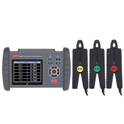 FR2020三相数字相位伏安表由主机、电流钳、测试线、防护套组成,同时存储500组数据,并具有数据静态保存功能。具有历史数据读取、查阅、保存、报表、打印等功能。
