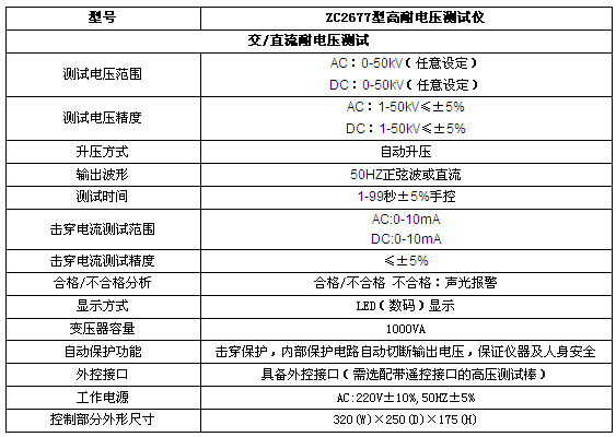 名称:ZC2677型高耐电压测试仪 型号:ZC2677 简介:50kV交/直流输出一机多用,自动升压有效确保人身安全。高电压、小电流、准确度高。更有DC输出可用于电容器耐压、漏电流、高压硅堆、晶体管反向电流测试。该机测试电压、击穿电流、时间同时显示,且有合格/不合格判定,声光报警,击穿保护等功能 1、交/直流耐电压测试仪,一机多用性价比高。 2、高电压、小电流、准确度高。 3、击穿电流、测试时间、连续任意设定,适用性强。 4、同时显示被测物实际值(时间、电压、电流),不合格声光报警。 5、自动升压有效确保人身安全. 6、高压击穿保护。 7、直流输出可测试电容器耐压、漏电流、高压硅堆、晶体管反向电压、反向电流 |
