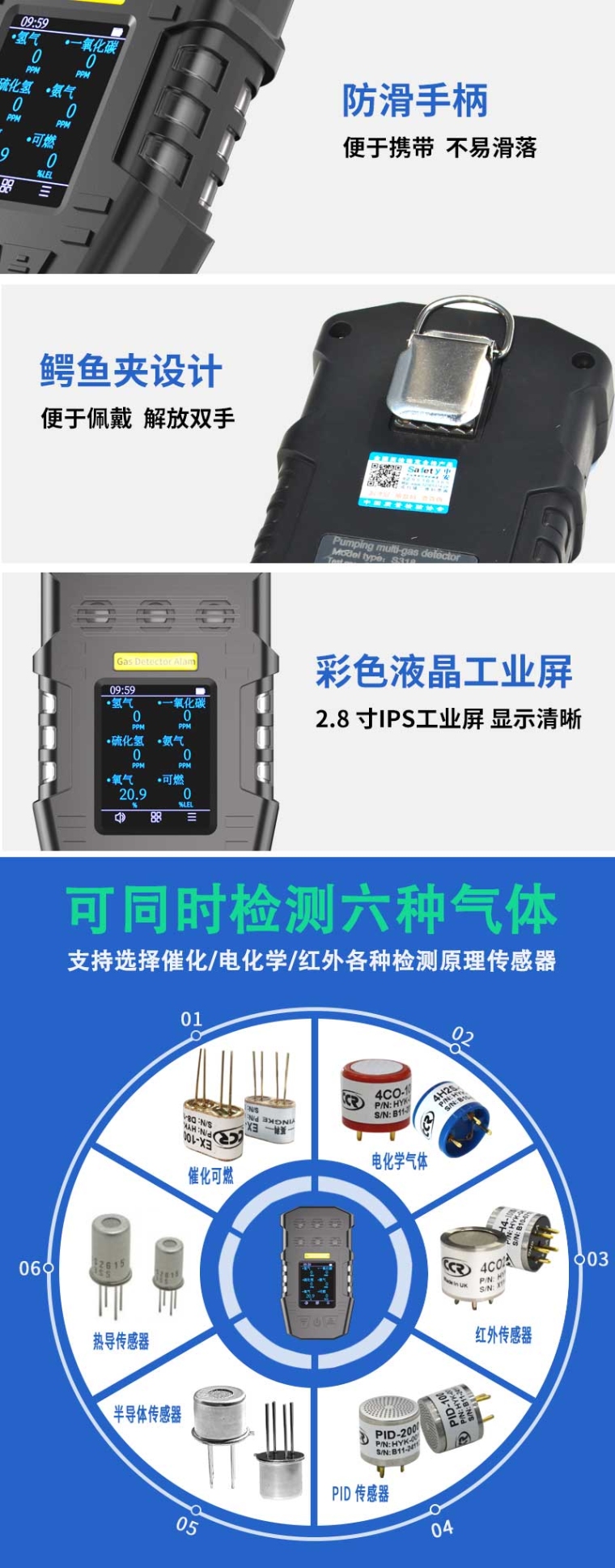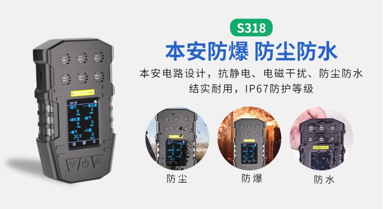 中安探测S318防爆型多气体检测报警器,可自由定制6种可燃气体或有毒有害气体传感器进行检测,防护等级IP67