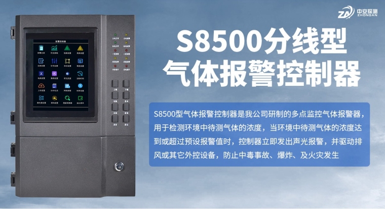 S8500型气体报警控制器是我公司研制的多点监控气体报警器,用于检测环境空气中待测气体的浓度,当环境中检测到待测气体的浓度达到或超过预置报警值时,控制器立即发出声光报警,以提醒我们及时采取安全措施,并启动执行器来控制驱动排风或其它外设设备,防止中毒事故、爆炸、及火灾发生,从而保障生命、财产的安全。