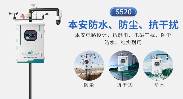 中安S520型厂界大气污染因子监测系统,利用大气污染因子(废气、毒气和粉尘)扩散运动,采用气体或粉尘传感器信号分析技术,可实时监测大气污染因子(废气、毒气和粉尘)