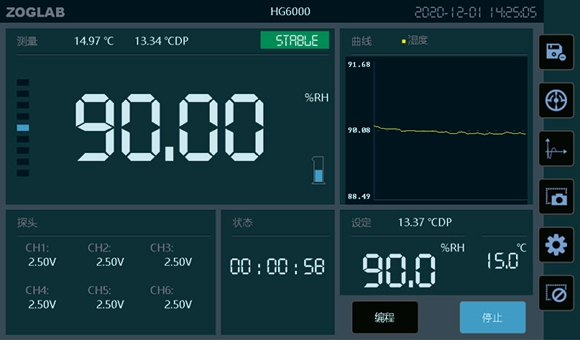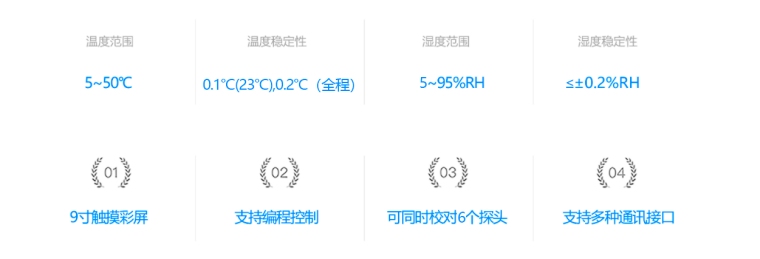 · 温度控制范围 5~50℃ · 湿度控制范围 5~95%RH · 湿度稳定性 ≤±0.2%RH · 温度稳定性 ±0.1℃ · 全量程范围内平衡时间小于10分钟 · 可同时校准 6个探头 双流法湿度发生器 内置双气泵/ 丰富的通讯接口/ 基于半导体恒温技术