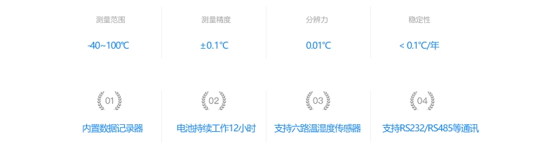 · 测量范围-40℃~100℃,0%~100%RH · 测量精度±0.1℃,±0.1℃RH · 长期稳定性< 0.1℃/年,< 0.1%RH/年 · 支持六路温湿度传感器 高精度温湿度测量表 内置数据记录仪 / 丰富的通讯接口 / 高性价比