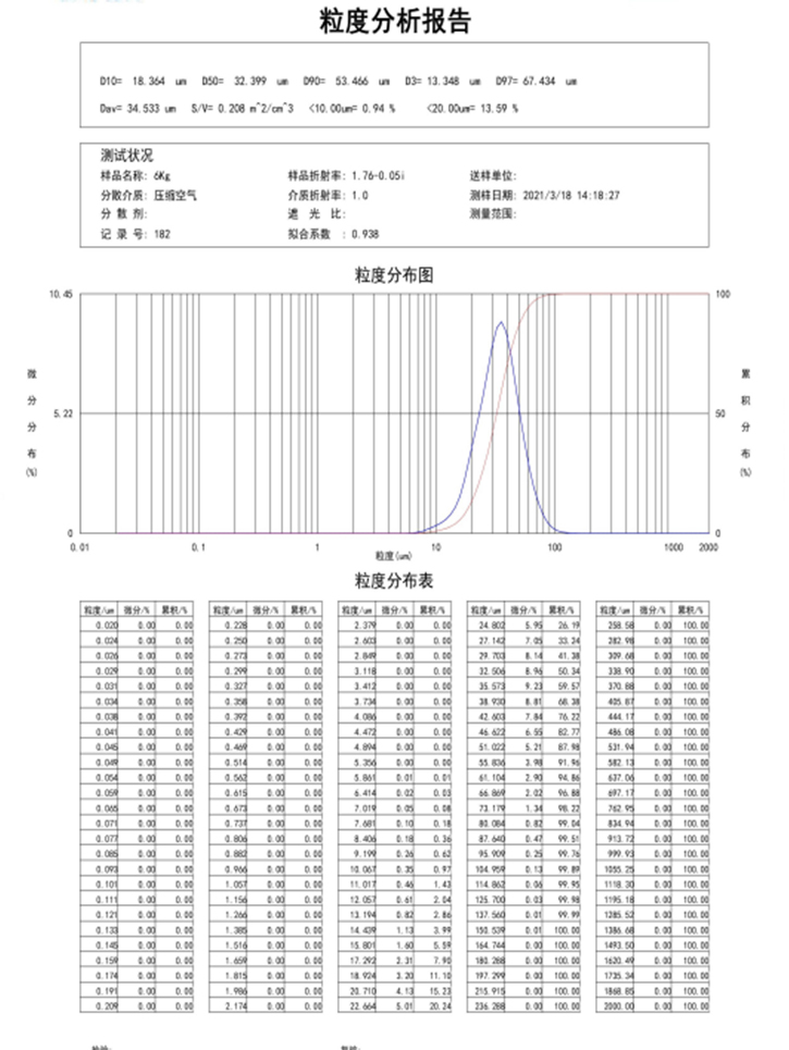 测试报告 测试报告中有粒度分布图形和粒度数据图表,有D10、D50、D90、平均粒径和比表面积等特征参数,有四个自定义参数根据需要自行输入,重量比表面积与体积比表面积可以互换。粒度数据可保存到EXCEL。支持中、英文格式测试报告打印,页眉和页脚可根据需要进行修改,有打印预览功能,能够将粒度分布图形和粒度数据图表存成图片或PDF格式,便与WORD交互使用。