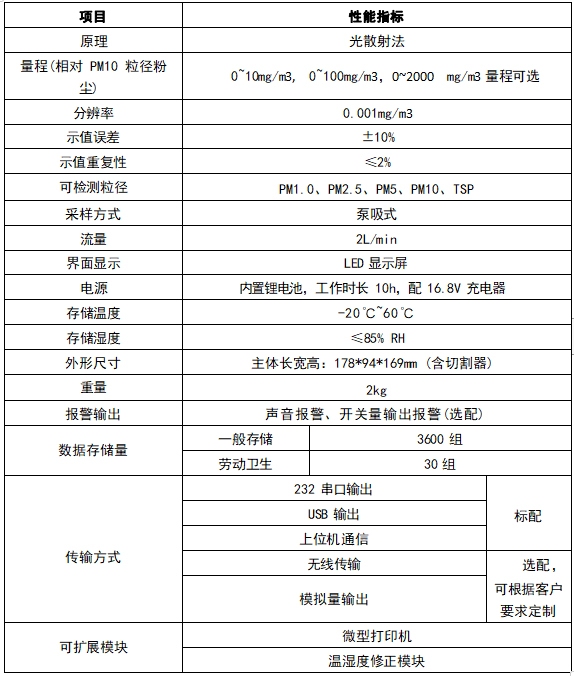 本产品执行 JJG 846-2015 《粉尘浓 度测量仪检定规程》,仪器主要由控制电路板、光学监测器、气泵、通信模块等构成,其原理是通过激光散射法对环境粉尘浓度进行测量, 实现定点监测以及测量数据的通信传输,可根据客户使用要求选择相对应的 PM1.0、PM2.5、PM5、PM10、TSP粒径分割器。 产品特点 1、实时显示粉尘质量浓度, 量程可至 2000mg/m3,可连续检 测,采样与间隔时间可调;; 2、可根据客户使用要求选择相对应的 PM1.0、PM2.5、PM5、PM10、TSP 粒径分割器 采用 90 度激光散射原理测量,自主技术, 精度更高,数据稳定 3、内置大容量锂电池, 可连续工作时长 10h; 4、内置高品质无刷电机隔膜泵确保使用寿命长, 流量稳定; 5、具有动态自动校准功能, 可消除仪器系统误差; 6、具有测量光路自动清洁功能,避免长时间测量后粉尘对仪器的影响,适应高粉尘浓 度工况; 7、多种数据接口, 可连接微型打印机, 可进行上位机通讯,实现与 PC 机进行数据通 信,检测数据可存贮、回放与自动绘制粉尘浓度曲线; 8、内置多种工作模式, 可直读 TWA 和 STEL 9、外观设计简单大方,安装方式多样,可选择壁挂、立杆安装、三脚支架安装等方式。