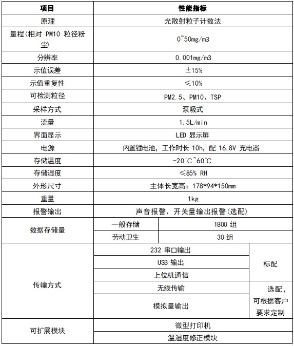 本产品执行 JJG 846-2015 《粉尘浓 度测量仪检定规程》,仪器主要由控制电路板、光学监测器、气泵、通信模块等构成, 其 原理是通过激光散射法对环境粉尘浓度进行测量, 实现定点监测以及测量数据的通信传输,可直接测量读取 PM2.5、PM10、TSP 值。 产品特点 1、实时显示粉尘质量浓度,量程可至 50mg/m3,可连续检测, 采样与间隔时间可调; 2、可直接测量读取 PM2.5、PM10、TSP 值; 3、采用激光散射粒子计数原理测量,自主技术, 精度更高, 数据稳定 4、内置大容量锂电池, 可连续工作时长 10h; 5、内置高品质无刷电机隔膜泵确保使用寿命长, 流量稳定; 6、具有动态自动校准功能, 可消除仪器系统误差; 7、多种数据接口, 可连接微型打印机, 可进行上位机通讯,实现与 PC 机进行数据通 信,8、内置多种工作模式, 可直读 TWA 和 STEL。