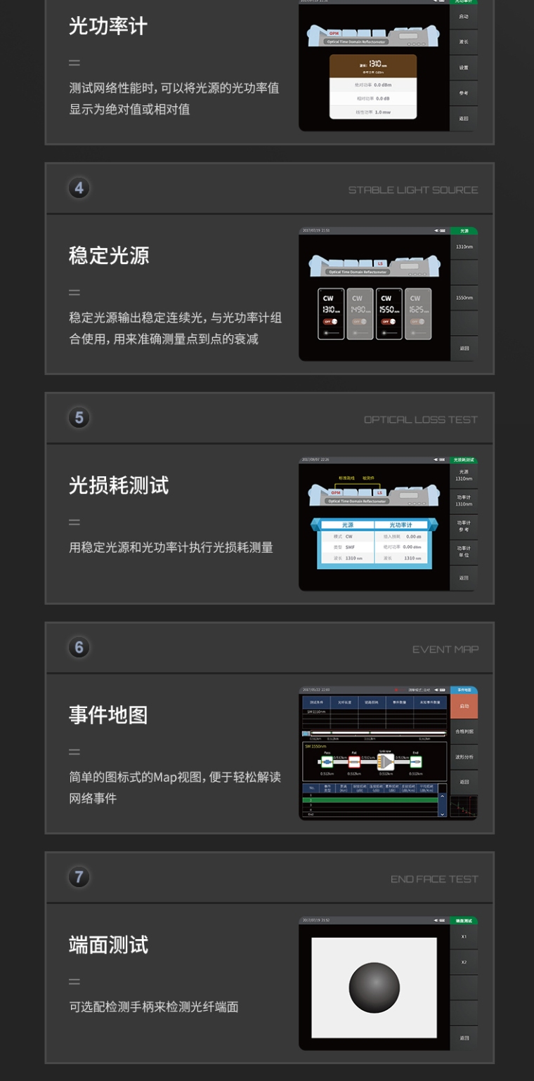 集成OTDR、红光源、稳定光源、光功率计、事件地图、光损耗测试功能