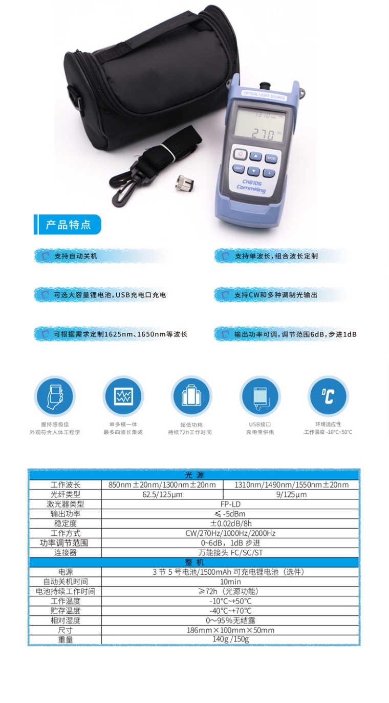 技术规格 | 产品名称 | 通信汪CK6105系列稳定光源 | | 型号 | CK6105M | | 工作波长 | 850/1300nm | | 光纤类型 | 62.5/125μm | | 激光器类型 | FP-LD | | 输出功率 | ≤-5dBm | | 稳定度 | ±0.02dB/8h | | 工作方式 | CW/270Hz/1000Hz/2000Hz | | 功率调节范围 | 0-6dB,1dB步进 | | 连接器 | FC/SC/ST(ST选配) | | 工作温度(℃) | -10~+60 | | 存储温度(℃) | -25~+70 | | 自动关机时间(min) | 10 | | 仪表尺寸(mm) | 186*100*50 | | 电源 | 5号电池*3 | | 重量(g) | 150g |