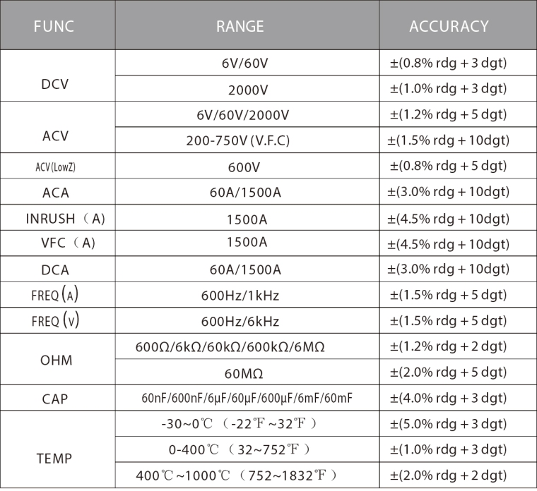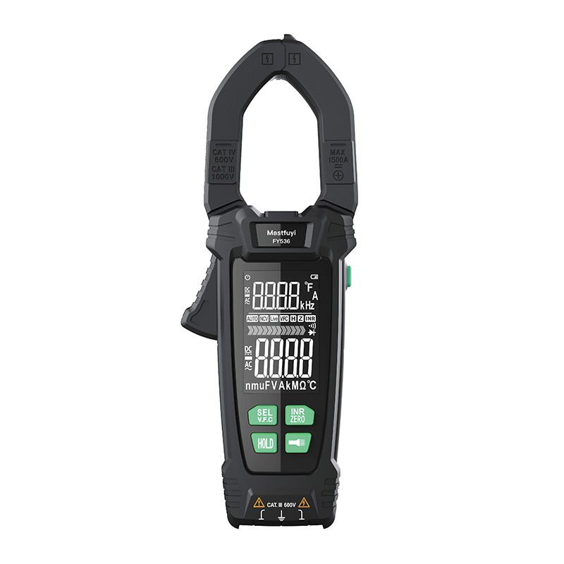 FEATURES Full protection, anti-high-voltage ignition circuit design, streamlined design, high-definition dual-display screen, small body and jaws suitable for hand-held as well as reaching into the precisearea, low impedance voltage test, true RMS test, clamp head frequency measurement, large capacitance 60mF, temperature test, automatic shutdown, NCV test, torch illumination, inrush current, VFC current, low-voltage displayLuminance, inrush current, VFC current, low voltage display, data hold, etc. |