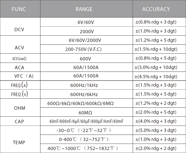 FEATURES Full protection, anti-high-voltage ignition circuit design, streamlined design, high-definition dual-display screen, small body and jaws suitable for hand-held as well as reaching into the precisearea, low impedance voltage test, true RMS test, clamp head frequency measurement, large capacitance 60mF, temperature test, automatic shutdown, NCV test, torch illumination, inrush current, VFC current, low-voltage displayLuminance, inrush current, VFC current, low voltage display, data hold, etc. |