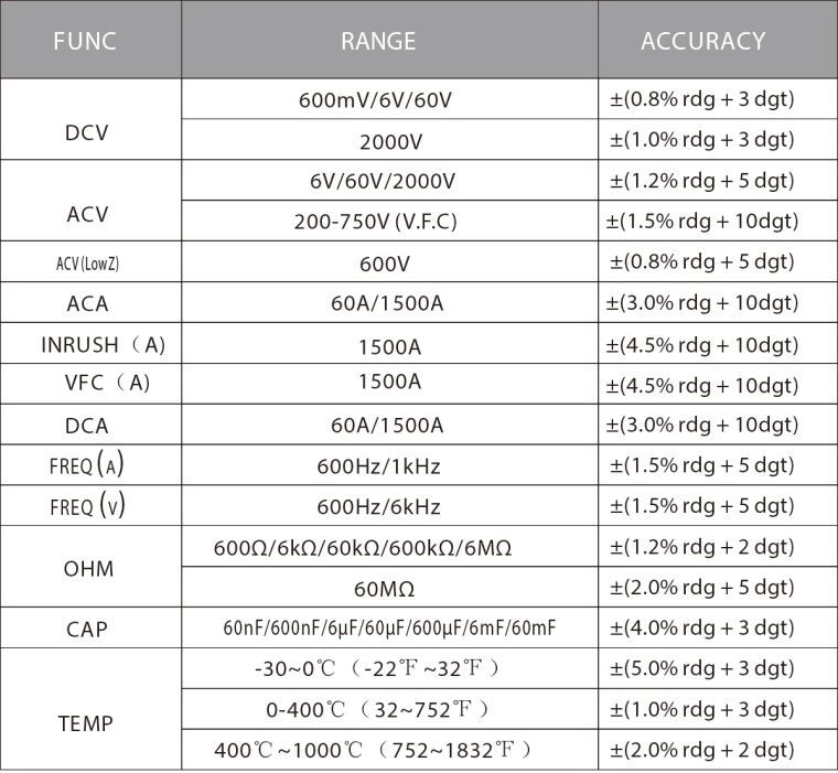 FEATURES Full protection, anti-high-voltage ignition circuit design, streamlined design, high-definition dual-display screen, small body and jaws suitable for hand-held as well as reaching into the precisearea, low impedance voltage test, true RMS test, clamp head frequency measurement, large capacitance 60mF, temperature test, automatic shutdown, NCV test, torch illumination, inrush current, VFC current, low-voltage displayLuminance, inrush current, VFC current, low voltage display, data hold, etc. |