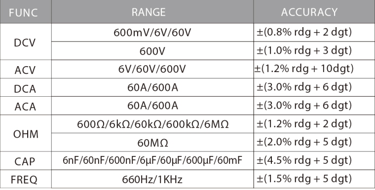 规格 安全等级:IEC61010-1, CAT III 600V LCD显示,最多6000个。阅读5999 采样率:约3次/秒 过载指示:“OL”或“OL” 极性显示:自动,“-”为负极 工作温度:0~40℃ 低电量指示: 电池:1.5V x3, AAA Max。夹具尺寸:Ø26mm 尺寸:218×78×32毫米 重量:约。244g(不含电池)