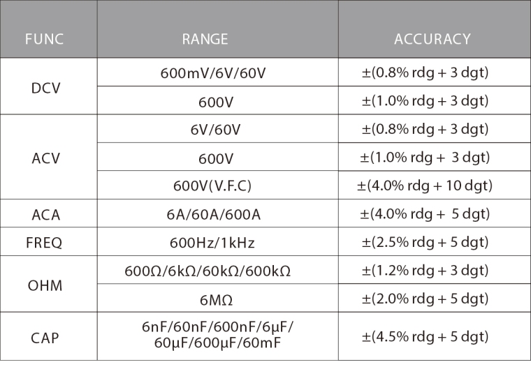 规格 安全等级:IEC61010-1, CAT III 600V LCD显示,最多6000个。阅读5999 采样率:约3次/秒 过载指示:“OL”或“OL” 极性显示:自动,“-”为负极 工作温度:0~40℃ 低电量指示: 电池:1.5V x3, AAA Max。夹具尺寸:Ø25mm 尺寸:218×78×32毫米 重量:约248g(不含电池)
