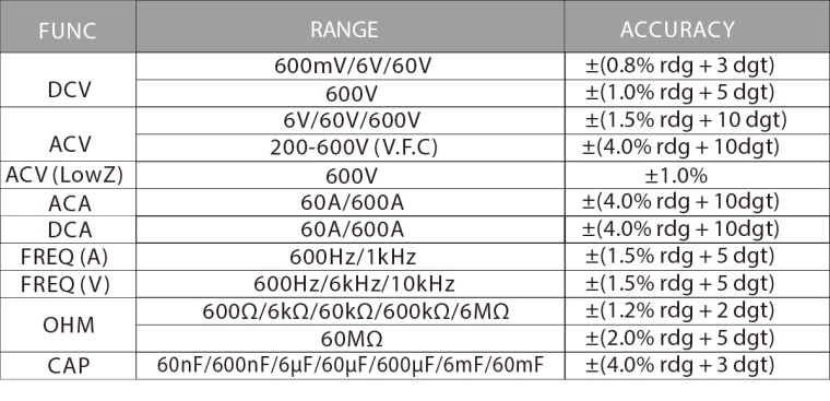 规格 安全等级:IEC61010-1, CAT III 600V LCD显示,最多6000个。阅读5999 采样率:约3次/秒 过载指示:“OL”或“OL” 极性显示:自动,“-”为负极 工作温度:0~40℃ 低电量指示: 电池:1.5V x2, AAA Max。夹具尺寸:Ø25mm 尺寸:191×70×37毫米 重量:约。195克(不含电池)