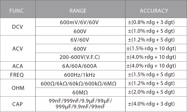 规格 安全等级:IEC61010-1, CAT III 600V LCD显示,最多6000个。阅读5999 采样率:约3次/秒 过载指示:“OL”或“OL” 极性显示:自动,“-”为负极 工作温度:0~40℃ 低电量指示: 电池:1.5V x2, AAA Max。夹具尺寸:Ø25mm 尺寸:191×70×37毫米 重量:约。195克(不含电池)