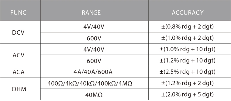 规格 安全等级:IEC61010-1, CAT III 600V 4000个计数LCD显示,最多阅读3999 采样率:约3次/秒 过载指示:“OL”或“OL” 极性显示:自动,“-”为负极 工作温度:0~40℃ 低电量指示: 电池:1.5V x2, AAA Max。夹具尺寸:Ø25mm 尺寸:185×71×35毫米 重量:约。172克(不包括电池)