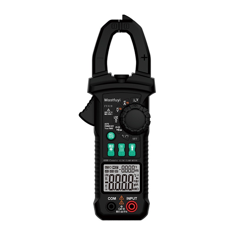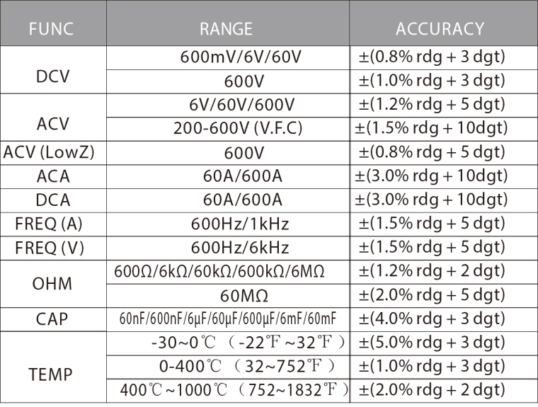 规格 安全等级:IEC61010-1, CAT III 600V LCD显示,最多6000个。阅读5999 采样率:约3次/秒 过载指示:“OL”或“OL” 极性显示:自动,“-”为负极 工作温度:0~40℃ 低电量指示: 电池:1.5V x2, AAA Max。夹具尺寸:Ø25mm 尺寸:191×70×37毫米 重量:约193克(不含电池)