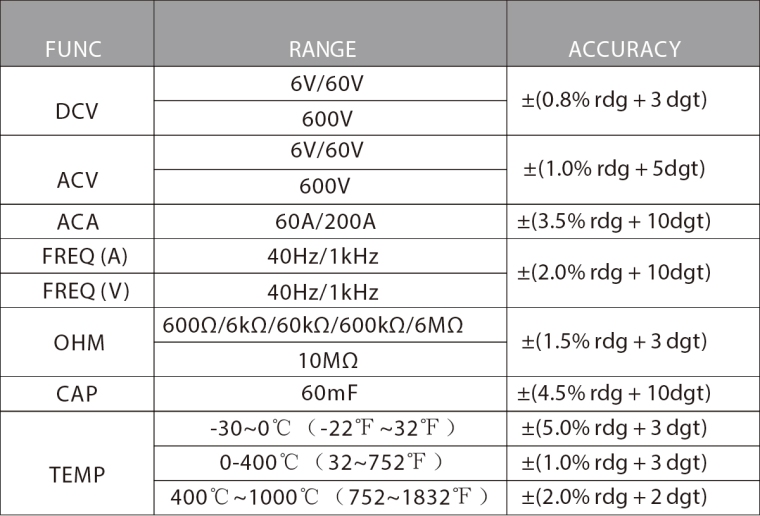 规格 安全等级:IEC61010-1, CAT III 600V 4000个计数LCD显示,最多阅读5999 采样率:约3次/秒 过载指示:“OL”或“OL” 极性显示:自动,“-”为负极 工作温度:0~40℃ 低电量指示: 电池:1.5V x2, AAA 最大夹具尺寸:Ø25mm 尺寸:177×66×30毫米 重量:约。136g(不含电池)