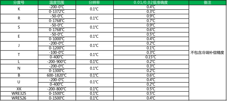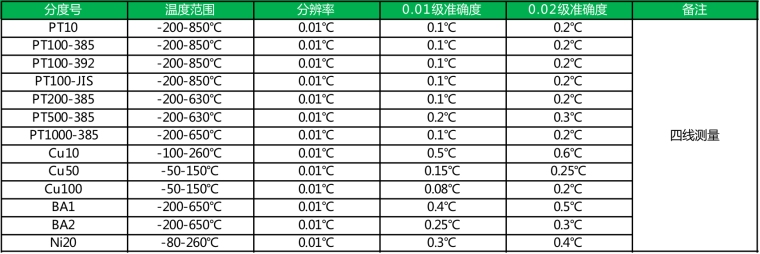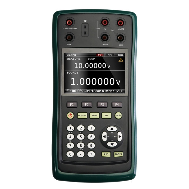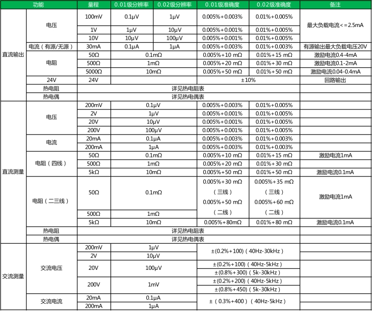产品特点 基本功能: ● 测量/输出:电压、毫伏、电阻、热电偶、热电阻、电流等; ● 带220VAC测量功能; ● 可模拟二线制变送器; ● 电阻测量可选二、三、四线3种测量方式; ● 精度为0.01%、0.02%两种; ● 两个相互隔离的通道,支持同步测量、输出; ● 可提供手动阶跃、自动阶跃、自动步进和手动步进功能; ● 采用3.5寸TFT液晶屏,分辨率480*320; ● 可同时显示测量和输出数据,也可单独显示测量或输出数据; ● 5000mAh锂电池供电; ● 具有自动电源关闭功能、时间可设,适合现场使用; ● 提供DC24V回路电源,以供现场调试之用; ● 热电偶测量和输出提供内置、外置和手动3种冷端温度补偿方式,其中外置参考端采用A级Pt100铂电阻、可输入证书值进行温度修正; ● 热电偶种类:R,S,K,E,J,T,N,B,L,U,XK,WRE325,WRE526; ● 热电阻种类:PT100-385,PT100-392,PT100-JIS,PT200-385,PT500-385,PT1000-385,Cu10,Cu50,Cu100,Nil20,BA1,BA2,PT10; 增强功能(选配): ● 温差测量功能:准确度达0.003℃,本产品可以测量空间内两点间的温度差,在0.4秒的时间内即可完成一次温差数据采集、有效提高了测量准确度;在测试过程中可实时计算测试过程中的10分钟波动性。使用标准铂电阻或者标准热电偶进行测量工作前,可通过证书值的输入对测量结果进行溯源,并满足恒温槽测试规范对电测仪器的要求。 ● 标准温度测量功能:与普通的热电偶测量及热电阻测量不同,该测量方式可使用证书值进行温度溯源,支持的标准热电偶● ● 热电阻的类型包括:标准热电偶S、R、B、T四种,标准铂电阻Pt25、Pt100两种。 使用任意传感器测量功能, 您可以方便的将被测物理量(压力、流速、温度等) 转换为电压、电流、电阻等易测物理量进行测量。 用户只需预先输入响应曲线,万用表将采用内部算法进行数值转换和修正,终将被测物理量显示在屏幕上。您可以随意编辑和修改被测物理量的显示单位。 ● 精密控温功能:使用精密控温功能,可以实现对恒温设备进行温度闭环控制,代替高精度PID控制器。在恒温设备及电网电压符合条件的情况下,设备的温度波动性可优于0.02℃/10min(恒温槽)。 ● ρ值测量功能:能够测量周期性方波信号的占空比,可用于对时间比例输出的各种数字温度指示调节器的PID参数进行检定及校准,并满足《JJG617-1996数字温度指示调节仪》规程的要求。 ● 热工换算功能:用于实现各种电量与温度间的相互换算,支持的电量与温度换算的类型包括:工作用热电偶、工业热电阻及各种温度变送器。 ● 数值设定方式:具有为灵活、便捷的输出值设定方式,可以通过数字键盘直接设定输出值,也可以通过方向键按位进行增量设定。另外,设备还具有可以编号辑的阶跃或者斜坡数值设定方式。 ● 正弦信号输出功能:一些过程记录仪(特别是机械式记录仪)的检定/校准,通常包括运行试验的环节,可以通过采用正弦信号输出方式为被检表提供信号。 ● 数据记录功能:具有强大的记录管理功能,多可以建立32个设备号,每个设备号具有16个记录页,每个记录页中包含时间、测量值、输出值及自定义值四个基本信息。用户可以根据需求进行设备管理、记录删除等操作。 型号说明: