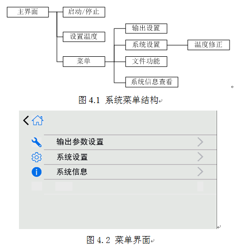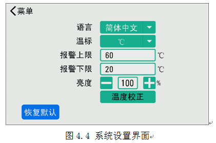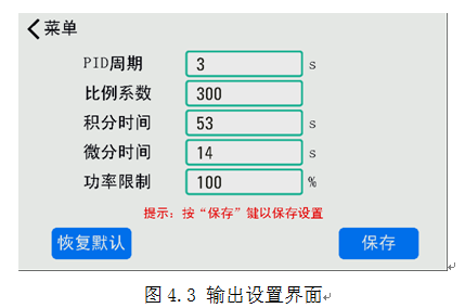 4、操作说明 4.1、菜单结构 ![]() 4.2、输出设置 系统采用PID方式控制恒温块温度,在出厂时,已预置了一组整定参数。用户可自定义设置以满足现场使用。在输出设置界面设置PID相关参数,输出设置界面如图5.2所示。点按恢复默认按键可将所有设置恢复为预设值。 注意:设置完成后按“保存”按键才会保存设置值,否则视为放弃修改。 PID周期设置 仪表的调节运算周期,单位为秒;设置范围:0~100,系统预设为3。该参数对调节品质影响较大,合适的数值能完善地解决超调及振荡现象,同时获得好的响应速度。建议在预设值的基础上修改。 PID比例系数设置 比例系数决定了比例带的大小。比例带越小,调节作用越强(相当于加大放大系数);相反,比例带越大,调节作用越弱。建议在预设值的基础上修改。 PID积分时间设置 积分时间决定了积分作用强度。积分时间短则积分作用强,消除静差的时间短,但过强的积分作用可能会导致温度稳定时较大幅度振荡。相反,积分时间长则积分作用弱,但消除静差的时间比较长。建议在预设值的基础上修改。 PID微分时间设置 微分时间决定了微分作用强度。微分时间长则微分作用强,对温度变化反应敏感,可减少温度过冲。但过强的微分作用可能会增大温度震荡幅度,和加长稳定时间。 功率限制 限定主输出功率。百分比表示,0~100,数值越大表示加热时输出功率越大,加热越快。系统预设为100%。 4.3、系统设置(下列部分功能需厂家授权方可使用) 系统设置包括语言设置、温标设置、报警设置、屏幕亮度设置、温度校正等。其中温度校正按键为进入温度校正界面的按键。系统设置界面如图4.4所示 4.3.1系统语言设置 支持简体中文和English两种系统语言,点击下拉菜单设置。 4.3.2系统温标设置 支持摄氏度℃和华氏度℉两种系统温标,点击下拉菜单设置。 4.3.3报警上限设置 用于设定上限报警点。当输出打开时,如果恒温块温度超过报警上限值,系统将弹出温度报警窗口,蜂鸣器鸣响,且输出将被关闭。设置范围为20℃~60℃,且不能比报警下限值小。 若不需要请设置为大值。 4.3.4报警下限设置 用于设定下限报警点。当输出打开时,如果恒温块温度低于报警下限值,系统将给出提示信息。设置范围为20℃~60℃,且不能比报警上限值大。 若不需要请设置为-1。 4.3.5屏幕亮度设置 百分比数值设置,从暗到亮,0~100,按 /-按键调节数值大小。 4.3.6温度校正 若主界面显示温度不准确,用户可通过温度修正界面进行修正。在系统设置界面下点按“温度校正”按键,进入温度校正界面如图4.5所示 有2种校正模式可以选择,分别是“线性校正”与“定点校正”。线性校正通过使用校准数据建立多个二元一次方程,来确保整个量程内的数据准确可靠。定点校正则是只修正固定设置温度点的误差,它在“定点校正表格”中的温度值和修正值均可更改。 系统提供了3个温度校准点,当仪器显示温度与真实温度有误差时,输入修正值,以修正当前显示。点按恢复默认按键可将所有设置恢复为出厂值。 注意:设置完成后按“保存”按键才会保存设置值,否则视为放弃修改。 4.4、系统信息 ![]() 在菜单界面下点按“系统信息”按键,跳转到系统信息界面,可查看系统信息。包括