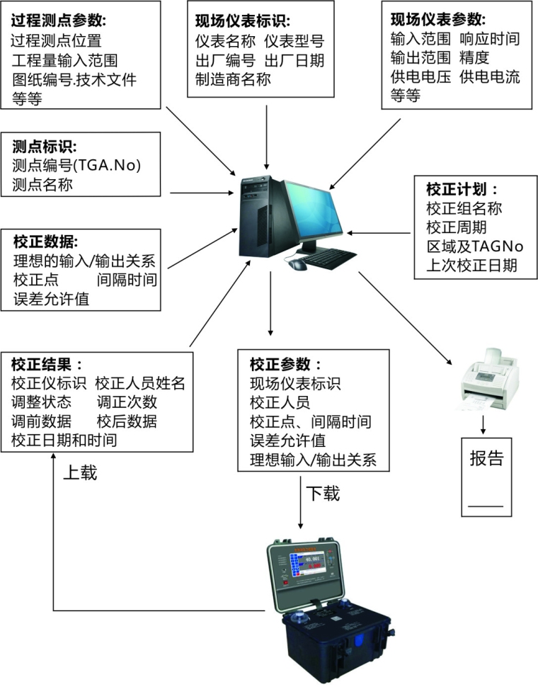 本软件是一套全自动的压力检定系统软件,用于压力仪表的日常检定和维护管理,采用我司ET-ZY系列全自动压力校验台(台式或便携式)、ET-AY系列精密压力校验仪、ETX系列手持校验仪等构成全自动压力检定系统,还可以管理压力、温度、流量、液位、电流、电压等仪表,构成仪表自动检定维护管理系统。 系统分现场全自动压力检定系统和检定室全自动压力检定系统两种。 现场全自动压力检定系统:适合在现场应用,通过自动检定软件把需检定的现场仪表参数下载到手持校验仪里,在检定过程中,校验仪自动把数据记录在内存中,检定好后,把检定结果上载回自动检定软件进行数据处理和报告打印。 检定室全自动检定系统:适合在检定室使用,所有的检定设备直接连计算机进行实时检定,构成了全自动的压力检定系统,仪表检定好后,数据处理工作也同步完成,立即可以打印检定报告和检定证书。 软件功能:● 自动检定热工仪表:全自动检定压力变送器、压力开关、压力表:只要一点鼠标(或开始键)就能按数据库设置控制全自动压力校验台,自动完成加压、减压、稳压、记录数据、分析误差、打印报告及证书等工作。 ● 支持多校验台多校验方式:一台计算机可以同时与多台ET-ZY系列全自动压力校验台相连,进行实时校验。支持单测点校验、双测点校验、四测点校验、上载下载检定方式。 ● 全面管理现场仪表的参数: (1)管理过程测点参数(2)管理现场仪表参数 ● 自动管理校验结果:可管理多年的校验结果:调前/调后两次测试结果。 ● 全面管理人员及标准设备: (1)管理检定人员(2)管理管理人员(3)管理标准设备 ● 方便产生工作任务单: (1)系统只需很短的时间就可以打印出某段时间(如一个月、一个星期)内已到期的必须校验的仪表清单、校验不合格的仪表清单和漏检(已安排校验,因某种原因未校)的仪表清单,非常有利于管理者安排工作。 (2)可以统计校前合格率。 ● 自动打印校验报告:校验报告的格式可以由用户指定。可以有多种格式。 ● 数据导出功能:能以EXEL或WORD格式将相关检定数据导出,也可进行第三方对接。 软件特点: ● 管理与检定一体化。管理系统可直接与全自动压力检验台或校验仪通讯,检定数据可以直接进入管理数据库。 ● 压力变送器、压力开关、压力指示表检定一体化。检定结果自动识别,分别存入相应的数据库。 ● 既可通过通讯方式录入检定结果,也可以手工输入检验结果,系统自动完成误差分析、自动生成检定结果数据库和检定报告、检定证书。 ● 系统可以保证检定报告的真实性。检定结果无法人为地改变,避免了通常会发生的事后凭记忆填写检定报告的现象,从而保证了检定报告真实可信、科学规范。 ● 本系统可以大幅度提高检定工作的的效率。 ● 系统软件分为网络版和单机版两种,系统采用SQL数据库。 系统支持的检定设备:● ET-ZY系列的台式、便携式全自动压力校验台 ● ET-AY系列精密压力校验仪、ET-BY系列精密数字压力表、ET-CY系列压力模块 ● ETX21系列多功能手持校准器或回路校准器、ETX-2026(或1826)多功能校验仪 执行的规程、规范: ● JJF1003-2008计量标准考核规范 ● JJG882-2005压力变送器检定规程 ● JJG544-2011 压力控制器检定规程 ● JJG52-1999 弹簧管式一般压力表、压力真空表和真空表检定规程 ● JJG49-1999 弹簧管式精密压力表和真空表检定规程 ● JJG875-2006 数字压力计检定规程 ![]() |