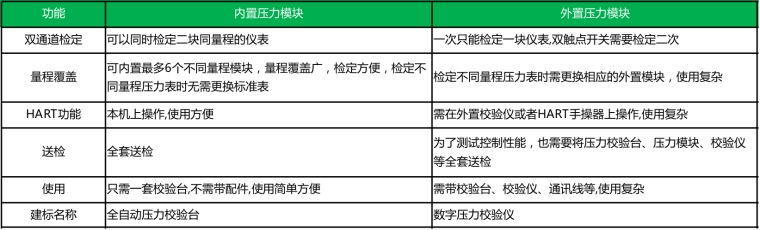 产品特点: 1、做为一款全自动的压力校验台,只要一按开始键就能自动完成加压、减压、稳压、记录数据、分析误差、打印检定报和证书等所有工作。 2、完全符合压力仪表检定规程,可以作为压力标准使用。 3、不采用高压气瓶就能提供稳定压力源,发生压力快速、稳定。 4、压力范围为(-100kPa~60MPa)。 5、12种压力单位可选:Pa,kPa, MPa, psi, bar, mbar, inH₂O, mmH₂O, inHg, mmHg, kgf/cm²,atm等。 6、可检定压力变送器、压力开关(压力控制器)、压力指示表。 7、具有压力开关的全自动检定功能。 8、具有完整保护功能,过压保护(如果超过量程的110%则会发出报警)、过流保护(当变送器电流超过20.5mA时)、泄漏、传感器故障等报警。当发生过压、过流、传感器故障时停止加压。 9、可存储100块现场仪表的调前与调后的各20组检定结果,具备自动检漏功能、任务管理功能。 10、可与检定软件自动检定系统相连,构成全自动压力检定系统,单位自由设定,只需轻点鼠标就可以完成压力检定工作,自动出具校验报告、检定证书。 11、具有过滤防堵排污系统,液压台采用内孔φ6mm的不锈钢管,现场仪表带来的杂质或污垢可以方便从排污空排出,在被校表接口上即使放入细沙,也不会损坏设置。气压台可配置气液分离器,防止被校表中的液体进入校验台。 12、采用智能稳压器,完全按中国的压力检定规程进行设计,上行程时,从下到上向检定点逼近,下行程时,从上到下向检定点逼近,不过调。 压力模块内置与外置的区别: