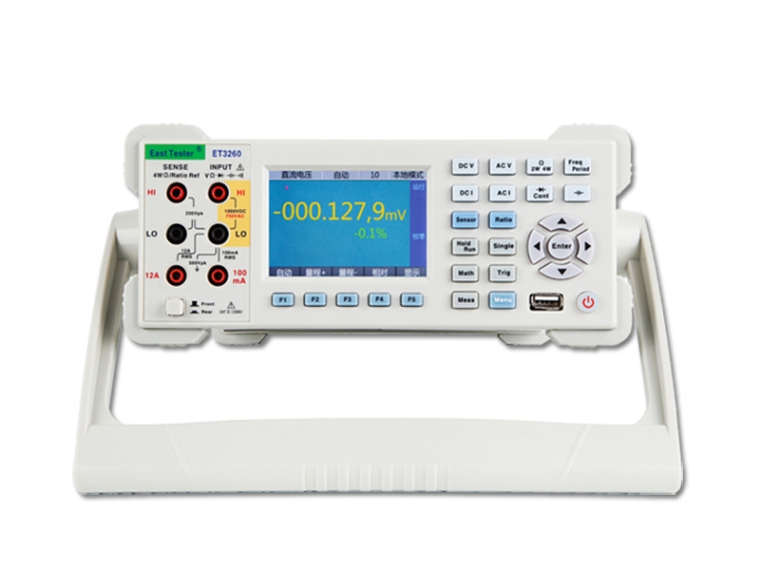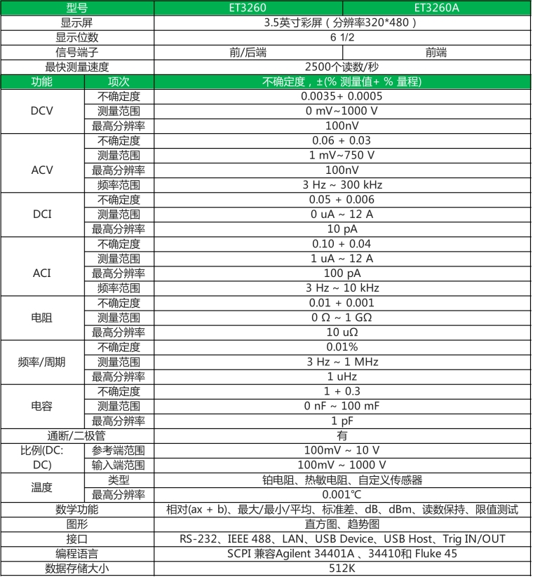 数字万用表作为电子测试领域不可缺少的产品之一,应用范围广泛。现代的数字万用表具有精度高、速度快、输入阻抗高、数字显示、读数准确、抗干扰能力强、测量自动化程度高等优点,因而被广泛应用,得到工程师的青睐。数字万用表的应用要求也有了非常大的发展变化。ET32系列万用表配备3.5英寸高分辨率彩色显示屏、内嵌智能操作系统,它能提供更多的信息、更多的功能,简易的操作,更宽的测试范围,系统的构建更灵活、方便等,它就是**这一发展趋势的新型数字万用表。 本产品特有的双基准校准功能、让使用者仅需1个10V标准电压和1个10kΩ标准电阻就可实现全部功能的校准,用户完成整机的校准时间不会超过1小时。 型号说明: 产品特点: ● 6 1/2位分辨率(ET3260/ET3260A);超量程显示:量程的120% ● 显示采用3.5英寸彩屏(分辨率320*480),显示内容丰富,可灵活显示各种图形界面,具有良好的显示效果。根据您的需求定制显示界面,支持图形、数字、数学等功能同时显示于界面上 ● 双参数显示,可显示同一输入信号的两项参数(例如交流电压测量下可同时显示交流电压值和交流频率值) ● 可通过IEEE 488接口(ET3260)、RS-232接口、LAN接口、USB Device接口进行远程操作 ● 具有触发输入和测量完成输出功能 ● 前面板带U盘端口,用于数据存储、程序升级和配置 ● 主机软件可由客户自行升级 ● 电阻二线、四线测量,10Ω和1GΩ扩展量程 ● 周期、频率测量,频率可达1MHz ● 电容测量 ● 温度测量,用户可自设传感器测量 ● 大可达12A电流测量能力 ● 多种数学功能:统计(大值、小值、平均值)、消零、dB、dBm、极限 ● 图形显示:趋势图、直方图、历史曲线、列表等显示方式 ● 支持SCPI编程语言,支持多种命令集(安捷伦34401A、福禄克45) ● 仪表的前后面板均提供输入端子(ET3260) ● 具有内部、外部校准功能 ● 测量速度:0.02NPLC~100NPLC,7档可选 技术指标: